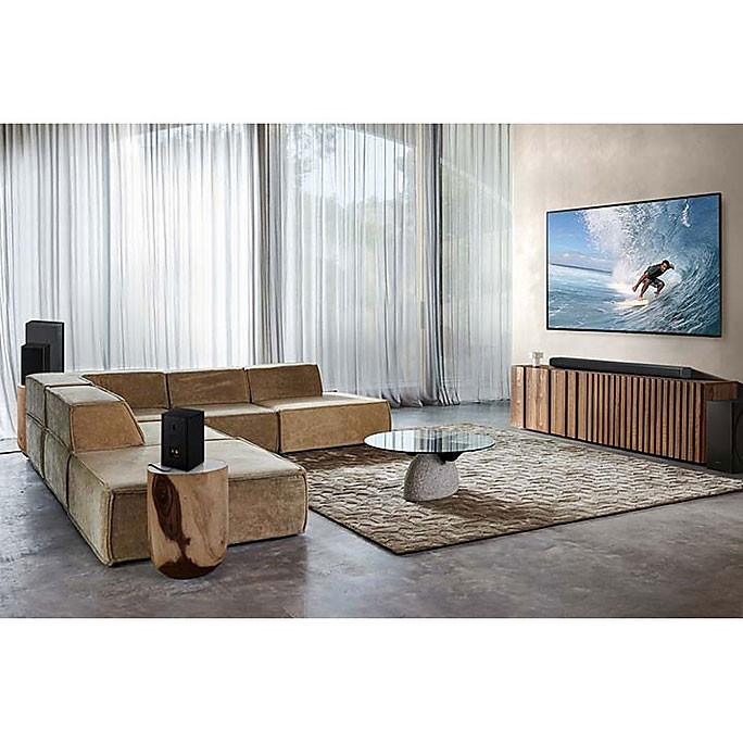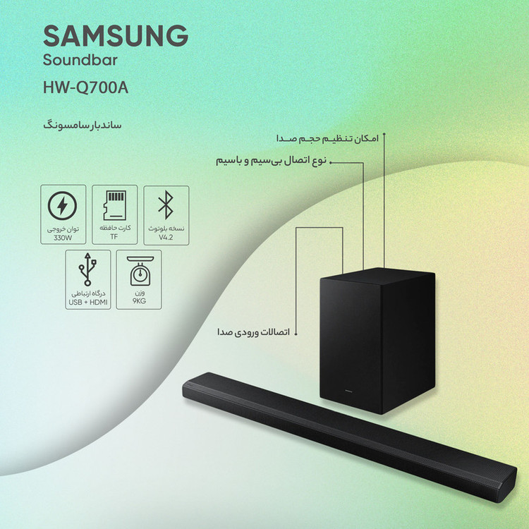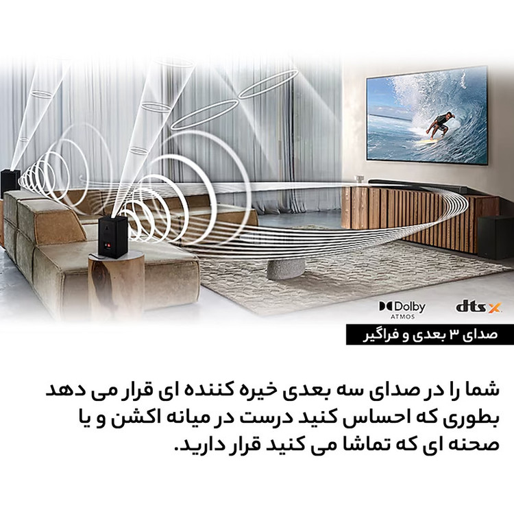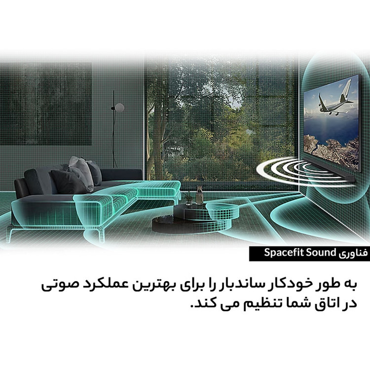 مجهز به اپلیکیشن SmartThings App - دارای 5 حالت صدا: Game Mode Pro (بازی)، Adaptive (تطبیقی)، Standard (استاندارد)، صدای فراگیر (Surround Sound)، Expansion (بسط دادن)