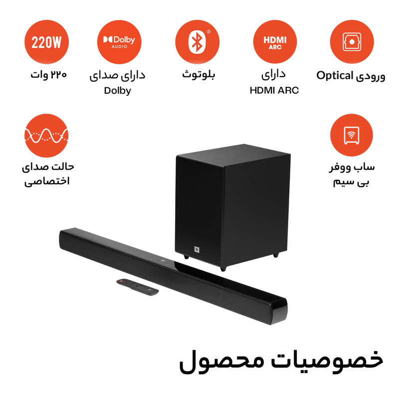 1 عدد ساندبار- 1 عدد ووفر- 1 عدد ریموت کنترل- 1 جفت پایه دیواری- 1 عدد دفترچه راهنما- 1 عدد کابل HDMI