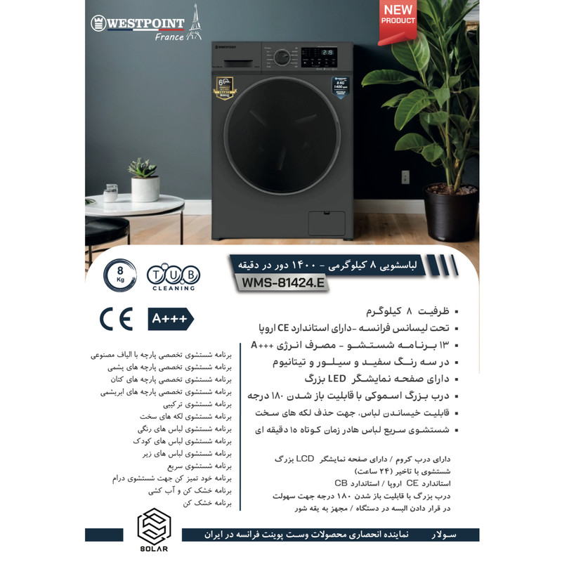 وست پوینت یکی از قدیمیترین برندهای فرانسوى لوازم خانگی است که از قرن 18 هم میلادی به تولید لوازم خانگی میپردازد. وست پوینت اینترنشنال در شهر بوردو فرانسه زمانی که این شهر یکی از اصلیترین قطب صنعتی بخش آتلانتیک اروپا بود تاسیس شد و صادرات محصولات خود را آغاز کرد. این برند در سال 1960 شروع به صادرات محصولات خود به منطقه منا (شمال آفریقا و خاورمیانه) کرد؛ امروزه این برند فرانسوی محصولات خود را در 86 کشور دنیا به فروش میرساند و با بیش از 20 کشور دنیا برای تولید محصولات خود برای تامین قطعات و .. همکاری میکند. این برند در زمینه تولید لوازمی چون یخچال، کولرگازیهای صنعتی، نیمه صنعتی و خانگی، ماشین لباسشویی، ماشین ظرفشویی و ... فعال است. لباسشويي وست پوينت فرانسه با ظرفيت ۸ كيلوگرم و حداكثر سرعت خشك كن 1400 دور در دقيقه يكی از با كيفيتترين محصولات بازار است.گرید انرژي این محصول فوق العاده +++A و همچنین دارای تکنولوژی شستشوی سریع با بهترین نتیجه می باشد ، این محصول داراي دیگ هانی کام (الماسه ) است که به شستشوی بهتر البسه شما کمک می کند. پنل LED بزرگ ، درب بزرگ اسموکی از دیگر مشخصات ظاهری محصول است. شستشوي تخصصی البسه کودك ، ۱۳ برنامه شستشو، برنامه شستشوي خسیاندن البسه جهت حذف لکه های سخت از سری برنامه های متمایز این محصول می باشد . تنظیم دما و سرعت ، قفل ایمنی کودك از دیگر ویژگی های این محصول است. تمامی محصولات وست پوینت تحت لیسانس فرانسه و دارای استاندارد CE اروپا می باشد .