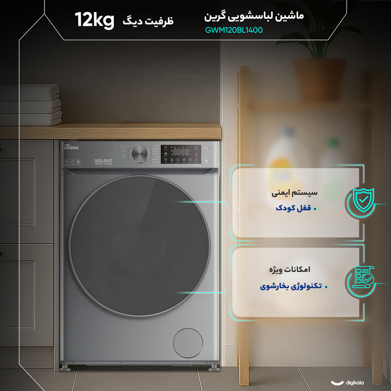 ماشین لباسشویی ۱۲ کیلوگرم اتوماتیک گرین مدل GWM120BL1400 یک دستگاه قدرتمند و مناسب خانوادههای پرجمعیت است که با ترکیب ظرفیت بالا، موتور دایرکت درایو و امکانات پیشرفته، شستوشویی کارآمد و دقیق ارائه میدهد. طراحی درب از جلو و بدنه استیل، ظاهر دستگاه را مقاوم و حرفهای میکند و دیگ الماسه از جنس استیل ضدزنگ نیز به حفظ دوام و جلوگیری از آسیب به بافت لباسها کمک میکند. ابعاد استاندارد شامل ارتفاع ۸۵ سانتیمتر، پهنای ۶۰ سانتیمتر و عمق ۶۴ سانتیمتر نصب آن را برای اغلب فضاهای خانگی آسان میسازد.