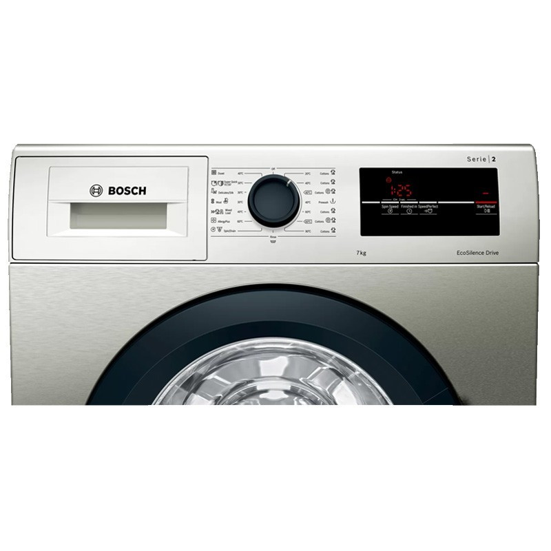 ماشین لباسشویی 7 کیلو بوش مدل WAJ2017SGC/2017 با رده انرژی +++A جزء لباسشویی های کم مصرف و پر طرفدار شرکت بوش میباشد. لباسشویی 2017 دارای ظرفیت 7 کیلوگرم بوده که مناسب برای خانواده هایی با جمعیت متوسط میباشد. طراحی دیگ به صورت موجدار بوده که موجب شستشوی آرام و کارآمد البسه میشود. پنل این لباسشویی دارای نمایشگر دیجیتال ، کلید های تنظیم عملکرد و ولوم چرخشی برای تنظیم برنامه ی شستشو میباشد. برنامه های شستشو شامل شستشوی الیاف نخی با دما های 20 ، 40 ، 60 و 90 درجه ، شستشوی اقتصادی با دمای 40 و 60 درجه ، شستشوی الیاف ظریف ، پشمی ، ملحفه و شستشوی سریع 15 دقیقه ای میباشد.