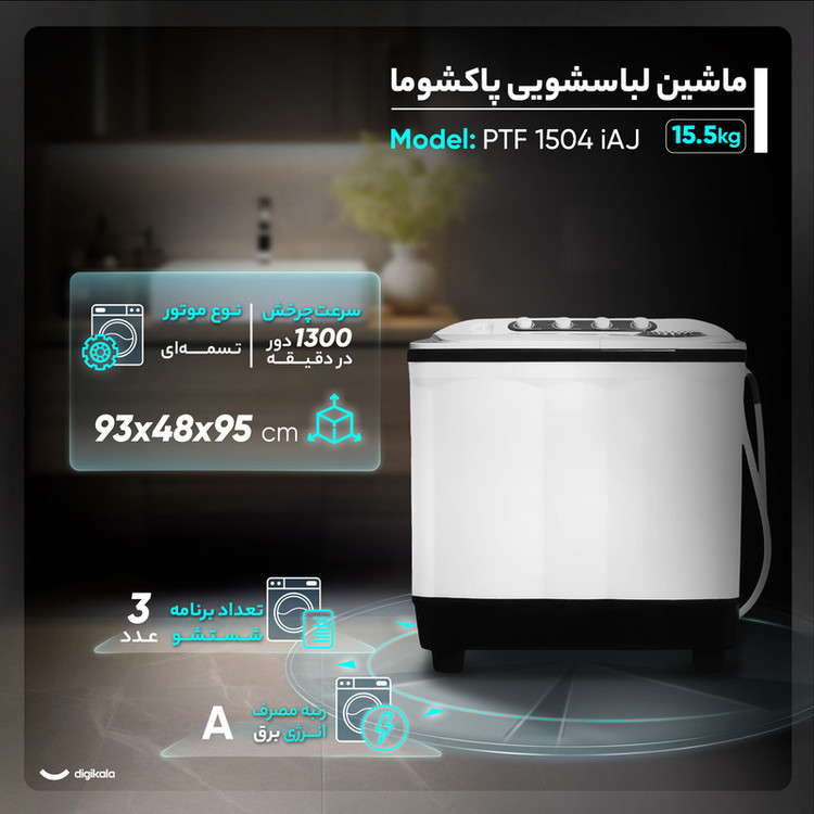 ماشین لباسشویی نیمه اتوماتیک پاکشوما مدل PTF 1504 iAJ ظرفیت 15.5 کیلوگرم