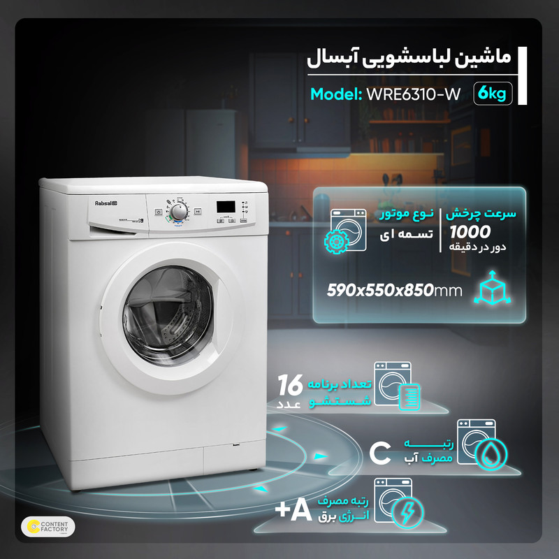 ماشین لباسشویی آبسال مدل WRE6310-W با ظرفیت دیگ 6 کیلوگرمی برای خانوادههای سه تا پنج نفره گزینه مناسبی است. درب این لباسشویی از جلو باز و بسته میشود و سرعت چرخش موتور آن 1000 دور در دقیقه است. این لباسشویی دارای برنامههای متنوعی برای شستشوی البسه است و شما میتوانید با توجه به نیاز خود به سراغ هر یک از این برنامهها رفته و با توجه به نوع لباسهایتان بهترین برنامه شستشو را انتخاب کنید. سیستم ضد چروک این لباسشویی به شما کمک میکند تا بتوانید لباسهایتان را پس از اتمام فرآیند شستشو با کمترین میزان چروک شدن تحویل بگیرید. سیستم عیبیاب هوشمند موجود در ماشین لباسشویی آبسال مدل WRE6310-W در صورت بروز هرگونه مشکل با نشان دادن خطا بر روی صفحهنمایش، کاربر از نوع مشکل مطلع میکند که این سیستم باعث صرفهجویی در وقت و هزینه میشود. رتبه انرژی این دستگاه +A است و شما میتوانید با کمترین میزان مصرف انرژی بالاترین عملکرد و راندمان را شاهد باشید.