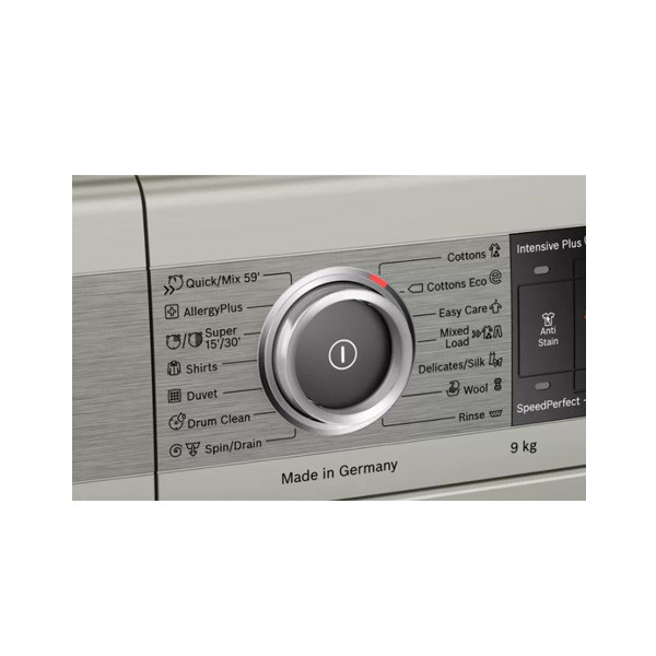 پنل ماشین لباسشویی 9 کیلویی 28MX0 دارای نمایشگر لمسی با ولوم چرخشی برای تنظیم برنامه های شستشو میباشد. با استفاده از پنل لمسی میتوان دمای آب، VarioPerfect ،speedPerfect و عملکرد شروع با تاخیر از 1 تا 24 ساعت را تنظیم نمود. برنامه های شستشو نیز شامل شستشوی ضد آلرژی، شستشو سریع ، لباس های جین، لباس های پشمی و لباس های نخی و … میباشد.