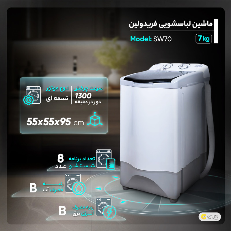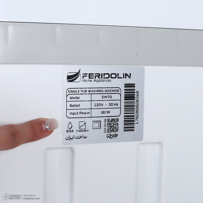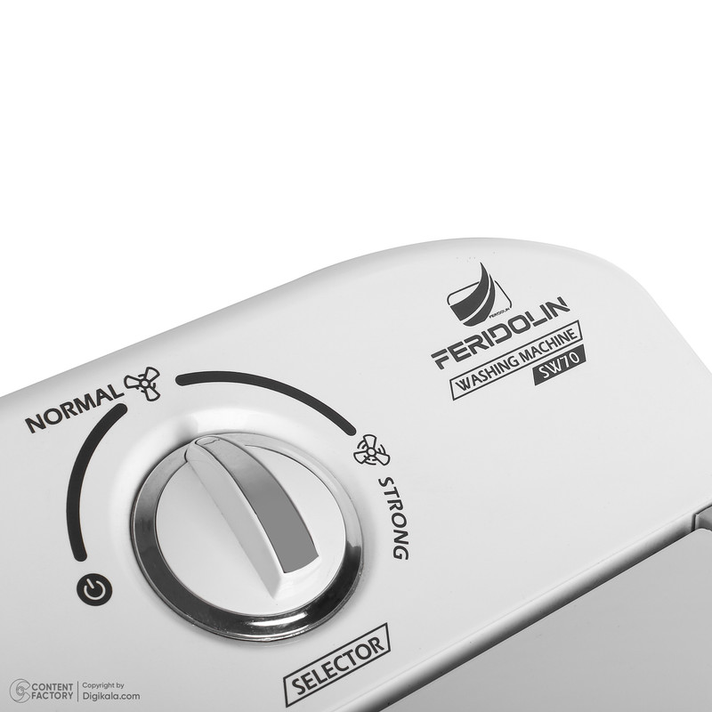 دستگاه «فریدولین» (Feridolin) مدل «SW70» یکی از ماشین لباسشوییهای کاربردی عرضهشده به بازار توسط این شرکت است که از طراحی ظاهری سادهای برخوردار است. جنس بدنه از پلاستیک است و فریم ABS ضد خط و خش دارد. این دستگاه از دسته ماشین لباسشوییهای در از بالا است که ظرفیت شستن 7 کیلوگرم لباس را دارد. در قسمت بالای این ماشین لباسشویی و در کنار در آن، دکمههای پیچی ولومی با کاربری آسان جهت تغییر تنظیمات بهصورت دستی در نظر گرفته شدهاند. این دکمهها امکان تنظیم زمان شستوشو از 3 تا 15 دقیقه و همچنین امکان تنظیم برنامه شستوشو را در سه حالت مختلف به کاربر میدهند. از دیگر ویژگیهای این دستگاه وجود رله حرارتی است که از سوختن موتور آن جلوگیری میکند. همچنین این مدل دارای سیفون تخلیه، سوپاپ تخلیه و فیلتر پرزگیر است که موجب بهبود عملکرد و بهرهوری دستگاه میشوند. در نظر داشته باشید که فریدولین، یک شرکت تولیدی صنعتی ایرانی است که پیش از 35 سال سابقه دارد. فعالیت اصلی فریدولین، در زمینهی تولید مینیواش و ماشینهای لباسشویی نیمهخودکار و خودکار در طراحها و مدلهای متنوع است. از ویژگیهای محصولات این شرکت میتوان به استفاده از فناوری روز در تولیدات، صرفهجویی در مصرف آب و مواد شوینده و کاهش زمان شستشوی لباسها اشاره کرد.