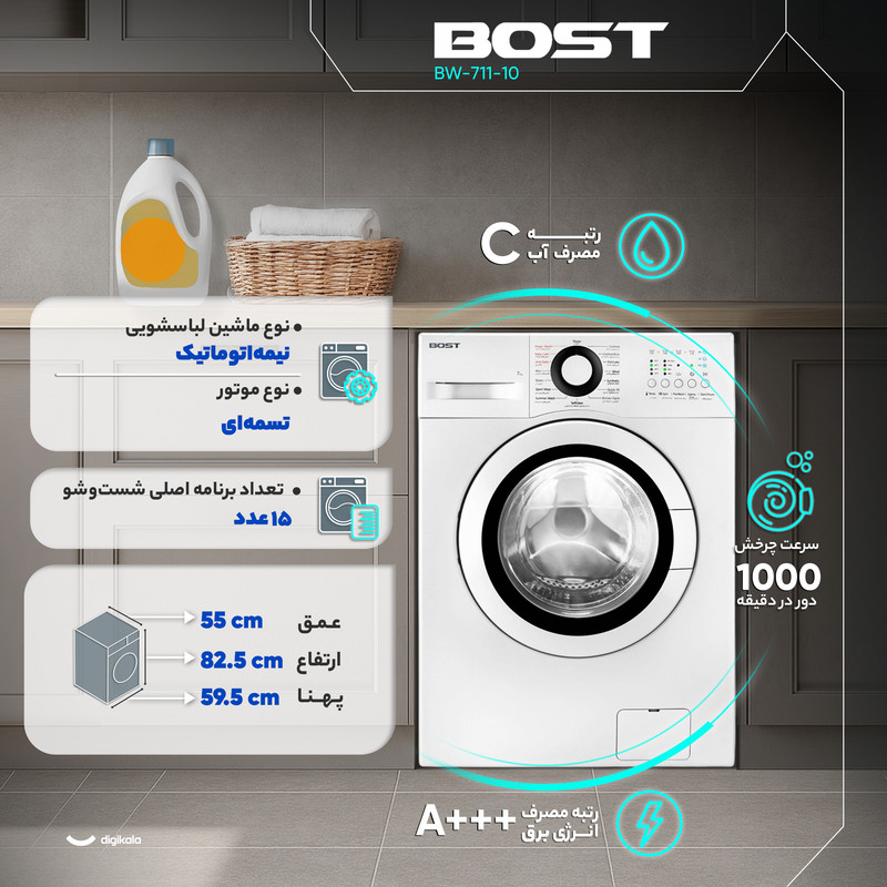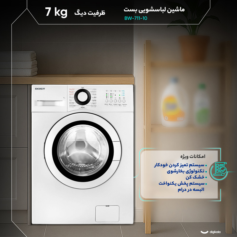 از امکانات ویژه میتوان به قابلیت خشککن، آبکشی شرعی برای تطهیر لباسها، انتخاب برنامهها با زبان فارسی و نبود نمایشگر وضعیت اشاره کرد که کاربری دستگاه را ساده ولی فاقد برخی امکانات بصری پیشرفته میکند. بدنه آلومینیومی با طراحی بادیگارد لرزش را کاهش داده و ابعاد ۸۲.۵×۵۹.۵×۵۵ سانتیمتر با درب از جلو و زاویه باز شدن ۱۵۰ درجه (بازشو به سمت چپ) امکان نصب آسان در فضای استاندارد را فراهم میآورد. BW‑711‑10 ترکیبی از کارکرد مطمئن، برنامههای متنوع و قابلیتهای ویژه ضدعفونی و بخارشوی را در یک دستگاه جمع کرده است.