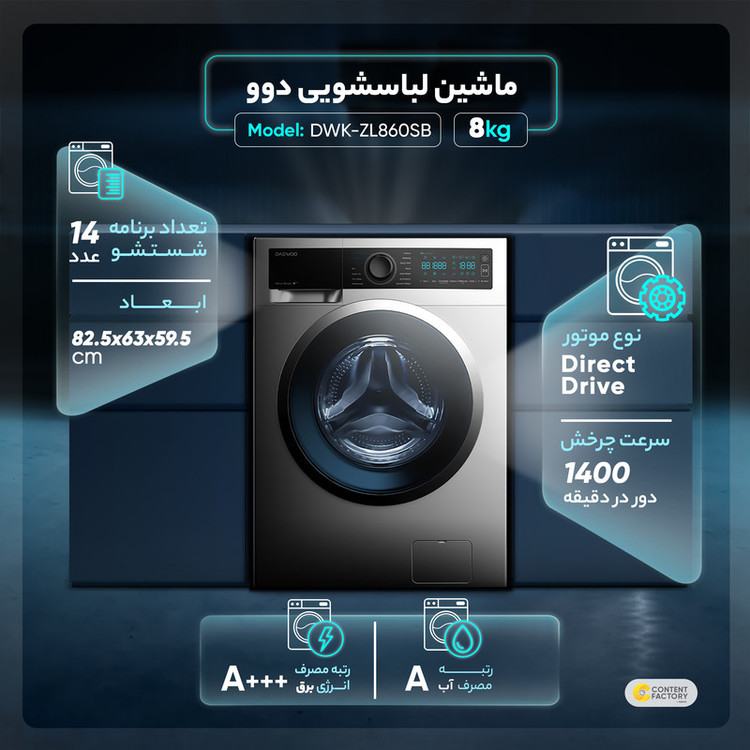 ماشین لباسشویی دوو مدل DWK-ZL860SB ظرفیت 8 کیلوگرم تمام اتوماتیک، مجهز به فناوری حبابساز، دارای موتور دایرکت درایو، 14 نوع برنامه شستوشو، دارای قفل کودک، مجهز به سیستم عیبیابی خودکار و قابلیت افزودن لباس هنگام شستوشو است. این ماشین لباسشویی، محصول جدید سال 2023 از برند دوو است که با ظرفیت 8 کیلوگرم میتواند مناسب استفاده خانوادههای با جمعیت متوسط باشد. در ساخت این ماشین از قطعات مستحکم و بادوامی استفاده شده است تا بتواند انواع البسه را به طور بهداشتی بشوید. بدنه این محصول هم بسیار با کیفیت است. قیمت این ماشین، به نسبت برندهای موجود در بازار بسیار اقتصادی و مقرون به صرفه به نظر میرسد. این محصول دارای چندین برنامه از جمله 14 برنامه شستوشو است که سبب شده تا این محصول گزینهای ایدهآل و کاربردی برای مصارف خانگی باشد. همچنین این برنامه به دکمههایی برای آبکشی اضافه، ذخیرهسازی تنظیمات دلخواه، دور خشککن قابل تنظیم، سیستم ضد چروک و اتوکشی آسان مجهز است. ماشین لباسشویی دوو مدل DWK-ZL860SB ظرفیت 8 کیلوگرم از قابلیت بالانس اتوماتیک البسه به منظور کاهش صدا و لرزش برخوردار است، بدین معنا که این ماشین قادر بوده به شکل اتوماتیک، وزن البسه داخل مخزن را تشخیص داده و سرعت چرخش موتور را بر مبنای آن تنظیم کند تا به دیگ ماشین فشار وارد نشده و سبب خرابی آن نشود.