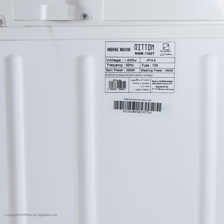 ماشین لباسشویی RWM-1102T از سری لباسشوییهای شرکت ریتون است که وزنی برابر 24 کیلوگرم دارد و ظرفیت دیگ آن 10.5 کیلوگرم است. جنس بدنه این لباسشویی ABS , PP بوده و توان موتور آن 180 وات است. توان موتور خشک کن این دستگاه ریتون 60 وات خواهد بود. تعداد موتور مورد استفاده در این لباسشویی دو عدد، تعداد گیربکسها هم دو عدد است. جنس وان داخل لباسشویی هم پلاستیک است. رتبه انرژی برای این لباسشویی ++A خواهد بود و سه برنامه شست و شو برای این لباسشویی وجود دارد. بدنه این لباسشویی دو جداره بسیار مقاوم است. از دیگر ویژگیهای این لباسشویی میتوان به موارد زیر اشاره کرد: مجهز به پمپ تخلیه آب و فیلتر پرز گیر - سیستم ایمنی توقف حرکت موتور در هنگام باز شدن درب خشک کن - دارای 2 ورودی آب مجزا - پروانه پرقدرت - دارای غلطک شستشو جهت یقه و سر آستین - سیستم ضد چروک - دارای شستشوی آبشاری 3D