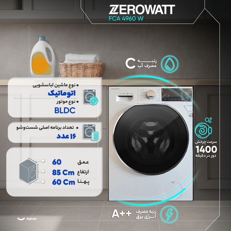 ماشین لباسشویی ۹ کیلوگرمی زیرووات مدل FCA 4960 W با بهرهگیری از موتور BLDC طراحی شده تا عملکردی کممصرف، قدرتمند و پایدار ارائه دهد. موتور بدونذغال BLDC به دلیل اصطکاک کمتر، راندمان بالاتری ایجاد میکند و این موضوع همراه با رده مصرف انرژی A++ باعث کاهش مصرف برق در چرخههای طولانی یا شستوشو با دماهای بالا میشود. سرعت چرخش دیگ برابر با ۱۴۰۰ دور در دقیقه طراحی شده و به خشکشدن بهتر البسه کمک میکند. ظرفیت ۹ کیلوگرم امکان شستوشوی حجم قابلتوجهی از لباسهای روزمره، پتو، ملحفه یا البسه حجیم را فراهم میکند و جنس دیگ از استیل ضدزنگ با ساختار الماسه انتخاب شده تا با افزایش سطح تماس ملایم با پارچهها کیفیت شستوشو بهبود یابد و در عین حال سایش الیاف کاهش پیدا کند. بدنه آلومینیومی دستگاه مقاومت خوبی در برابر رطوبت و تغییرات دمای محیط ایجاد میکند. این مدل دارای ۱۶ برنامه اصلی شستوشو است و برنامههایی مانند شستوشوی اقتصادی، شستوشوی خودکار، شستوشوی سریع، برنامه مخصوص لباس کودک، شستوشوی پتو و حالت مخصوص لباسهای ورزشی تنوع بالایی فراهم میکند. برنامه Drum Clean امکان شستوشوی داخلی دیگ را در بازههای زمانی مشخص فراهم میسازد تا رسوبات، آلودگی و بوهای نامطلوب کاهش یابد. وجود سنسور وزن موجب تنظیم خودکار مدتزمان، میزان آب و شدت چرخش میشود و مصرف انرژی و آب به شکل هوشمند کنترل میگردد. قابلیتهایی مانند اضافهکردن لباس در حین کار، خشککن، تنظیم دما، تنظیم سرعت چرخش و شروع شستوشو با تأخیر انعطاف بالایی در مدیریت چرخهها ایجاد میکند. سیستم کنترل میزان کف، قفل کودک و تشخیص هوشمند خرابی نیز از اجزای ایمنی و مدیریتی دستگاه هستند. نمایشگر دیجیتال اطلاعات عملکرد را بهطور شفاف نشان میدهد و کنترلها ترکیبی از دکمههای لمسی و کلید چرخشی هستند. ابعاد ۸۵×۶۰×۶۰ سانتیمتر نصب دستگاه در فضاهای استاندارد را آسان میکند و مجموع این ویژگیها مدل FCA 4960 W را به انتخابی قابلاعتماد، قدرتمند و کارآمد برای استفاده روزمره تبدیل میکند.
