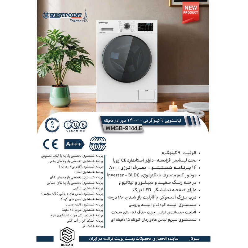 لباسشويي وست پوينت فرانسه با ظرفيت 9 كيلوگرم و حداكثر سرعت خشك كن 1400 دور در دقيقه يكی از با كيفيتترين محصولات بازار است. گرید انرژي این محصول فوق العاده +++A و همچنین داریر موتور کم مصرف با تکنولوژی اینورتر (INVERTER) و BLDC می باشد ، این محصول داراي دیگ هانی کام (الماسه ) است که به شستشوی بهتر البسه شما کمک می کند. پنل LED بزرگ ، درب بزرگ اسموکی از دیگر مشخصات ظاهری محصول است. شستشوي تخصصی البسه کودك ، 14 برنامه شستشو، برنامه شستشوي BABY CARE ( آنتی باکتریال ) ، برنامه شستشوي کاملاً بی صدا (SUPER SILENT) از سری برنامه های متمایز این محصول می باشد . برنامه شستشوی سریع و کامل تنها در ۱۵ دقیقه یکی از برنامه های جذاب این لباسشویی می باشد . تنظیم دما و سرعت ، قفل ایمنی کودك از دیگر ویژگی های این محصول است. تمامی محصولات وست پوینت تحت لیسانس فرانسه و دارای استاندارد CE اروپا می باشد .