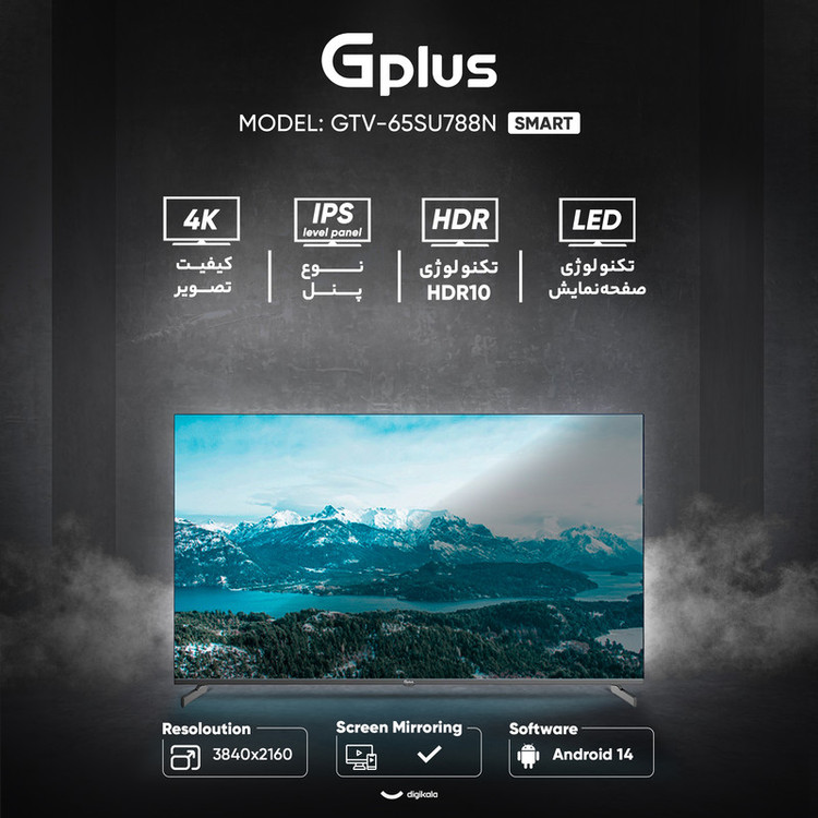 تلویزیون ۶۵ اینچ ال ای دی هوشمند جی پلاس مدل GTV‑65SU788N با طراحی تخت و بهرهگیری از تکنولوژی LED، تصویری با کیفیت 4K و رزولوشن ۲۱۶۰ × ۳۸۴۰ ارائه میدهد و نسبت تصویر ۱۶:۹ همراه با پنل IPS level موجب ایجاد زاویه دید گسترده و نمایش پایدار رنگها در موقعیتهای مختلف میشود. استفاده از نور پسزمینه DLED یکنواختی روشنایی را افزایش میدهد و حداکثر نرخ بهروزرسانی ۶۰ هرتز پخش روان محتواهای روزمره و ویدئویی را تضمین میکند. پشتیبانی از فرمت HDR۱۰ نیز محدوده دینامیکی وسیعتری ایجاد میکند و به بهبود جزئیات روشن و تیره در صحنههای گوناگون کمک میکند. توان خروجی کلی صدا ۲۴ وات است و خروجی دیجیتال اپتیکال امکان اتصال به تجهیزات صوتی تکمیلی را فراهم میسازد و ترکیب توان صوتی با نمایشگر بزرگ تجربه تماشای یکپارچهتری را ارائه میدهد. مجموعه درگاهها شامل دو درگاه HDMI، یک درگاه USB با نسخه USB ۲.۰، رابط کامپوزیت، پورت LAN، جک ۳.۵ میلیمتری صدا، خروجی دیجیتال و ورودی آنتن است و گیرنده دیجیتال داخلی DVB‑T۲ دریافت مستقیم شبکههای تلویزیونی را امکانپذیر میکند. سیستمعامل Android نسخه ۱۴ با حافظه داخلی ۱۶ گیگابایت قابلیتهایی مانند شبکه بیسیم Wi‑Fi، بلوتوث، مرورگر وب، پخش آینهای و امکان نصب برنامه و بازی را ارائه میدهد و محیط نرمافزاری روان تعامل سادهتری با امکانات دستگاه فراهم میکند. گرید انرژی A+ و منبع تغذیه AC ۲۲۰ تا ۲۴۰ ولت مصرف بهینه دستگاه را تضمین میکنند و شکل پایه دو شاخه ثبات مناسبی روی سطوح گوناگون ایجاد میکند. این مدل در سایز ۶۵ اینچ عرضه شده و اقلام همراه شامل ریموت کنترل و دفترچه راهنما است و مجموعه قابلیتهای تصویری، صوتی و هوشمند آن تجربه تماشای قابل اعتمادی برای استفاده چندرسانهای و پخش آنلاین فراهم میسازد.