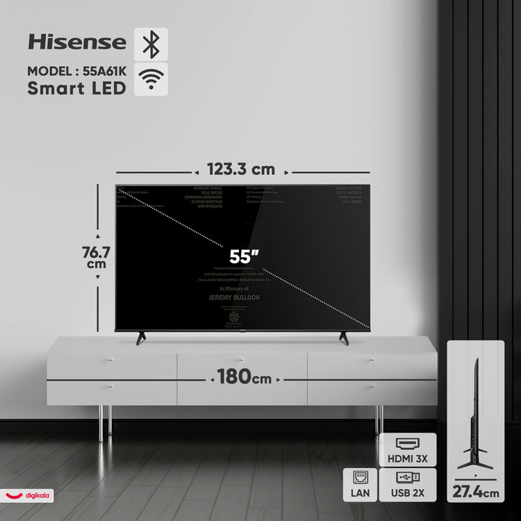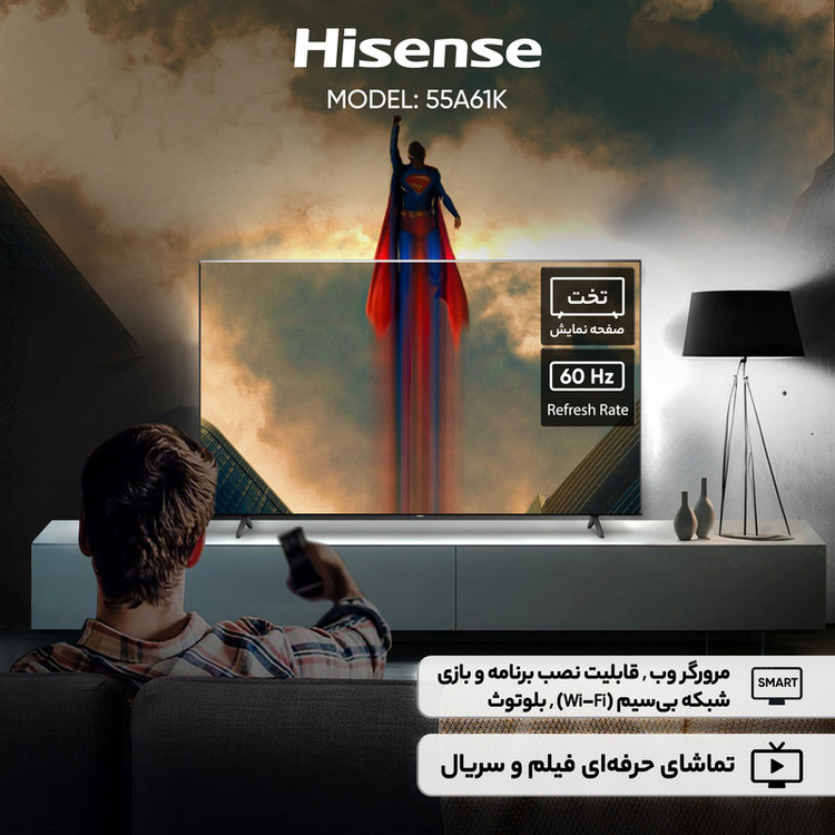 طراحی صفحه تخت، پایههای دوشاخه و وزن مناسب، ظاهر این مدل را ساده و امروزی نشان میدهد. مجموع این ویژگیها باعث شده تلویزیون ۵۵ اینچ ال ای دی هوشمند هایسنس مدل 55A61K گزینهای مناسب برای تماشای حرفهای فیلم و استفاده چندمنظوره در خانه باشد.