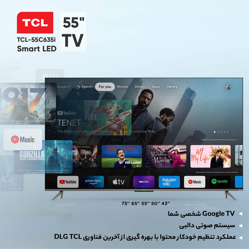 تی سی ال یکی از برندهای معتبر چینی در زمینه تولید انواع لوازم خانگی است و تلویزیونهای باکیفیتی هم تولید میکند. تلویزیون هوشمند تی سی ال مدل 55C635i یک مدل 55 اینچی با ویژگیهای مختلف و توانایی اتصال به اینترنت است. این مدل دارای رزولوشن تصویر 4K است و کنتراست رنگی بالایی دارد که در کنار ویژگی HDR10+ کیفیت بسیار خوبی را به نمایش میگذارد. وجود سیستم عامل اندرویدی و نرم افزار گوگل تیوی اجازه اتصال به اینترنت را میدهد و به راحتی میتوانید از انواع تفریحات و ویژگیهای مختلف مانند پخش آنلاین فیلم و سریال یا نصب اپلیکیشنهای مختلف بهره ببرید. همچنین میتوانید گوشی و دیگر لوازم هوشمند خود (حتی لوازم خانگی) را به تلویزیون از طریق وای فای متصل کنید و از امکانات مختلف لذت ببرید. این تلویزیون باریک و جذاب البته کیفیت صدای بسیار خوبی هم دارد و چه برای انجام بازیهای ویدیویی و چه دیدن فیلم و سریال با بهترین کیفیت روی آن حساب باز کنید.