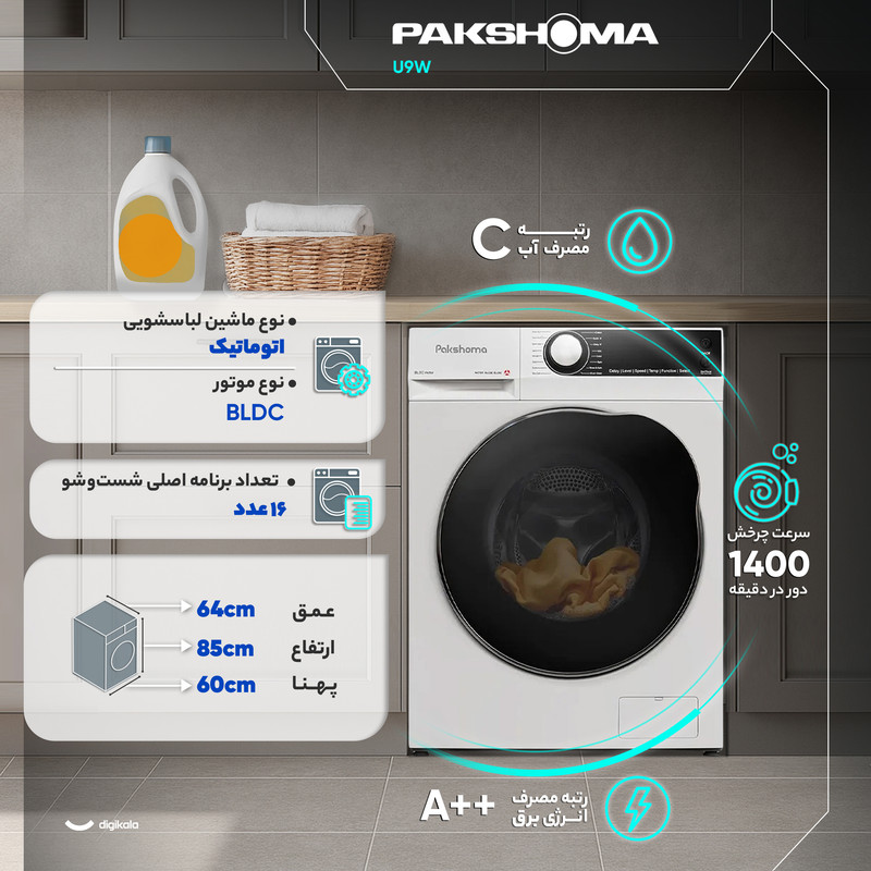 ماشین لباسشویی 9 کیلوگرم اتوماتیک پاکشوما مدل U‑9 یکی از مدلهای پیشرفته و خوشساخت این برند است که با بهرهگیری از فناوریهای مدرن، طراحی کاربردی و مصرف بهینه، گزینهای مناسب برای خانوادههای متوسط تا پرجمعیت بهحساب میآید. این دستگاه با بدنه آلومینیومی مقاوم تولید شده و طراحی درب از جلو با باز شدن به سمت چپ، استفاده روزمره را سادهتر میکند. ابعاد 80 سانتیمتر ارتفاع، 60 سانتیمتر پهنا و 60 سانتیمتر عمق باعث میشود محصول در اکثر فضای استاندارد کابینتها بهراحتی جا بگیرد. کنترل دستگاه از ترکیب دکمههای لمسی و سلکتور چرخشی انجام میشود و نمایشگر دیجیتال نیز وضعیت شستوشو، زمان باقیمانده و تنظیمات فعال را با وضوح مناسب نمایش میدهد.