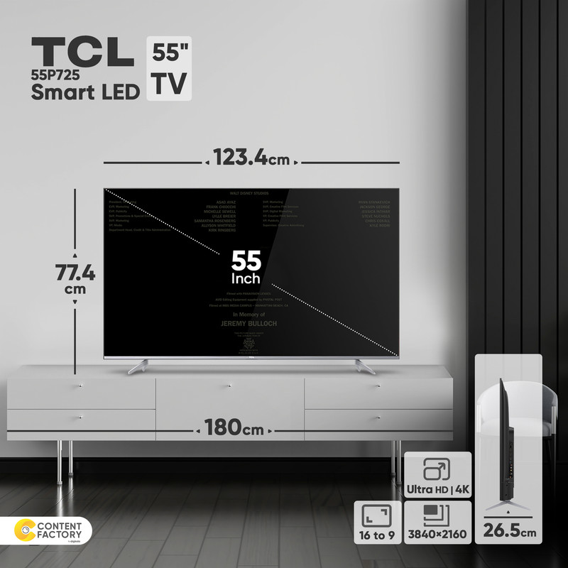 تلویزیون ال ای دی تی سی ال مدل 55P725 سایز 55 اینچ محصولی بادوام و خوشساخت از این برند است که امکانات متعددی را در اختیار کاربرانش میگذارد. رزولوشن صفحه نمایش این تلویزیون 3840x2160 بوده و تصاویر را با وضوح و شفافیت بسیار خوبی نمایش میدهد. زاویهدید وسیعی دارد و امکان تماشای صفحهنمایش را از محدوده وسیعی فراهم میکند. نسبت تصویر آن 16:9 است و تصویر را با ابعاد متناسبی به پخش میگذارد. شرکت سازنده برای این مدل، دو عدد درگاه USB در نظر گرفته شده است. با استفاده از این 2 پورت میتوانید فلشمموری و هارد اکسترنال خود را به تلویزیون متصل کرده و از فایلهای موجود در آنها استفاده کنید. برای اتصال پخشکنندهها به این تلویزیون میتوانید درگاه HDMI را انتخاب کنید. فرمتهای تصویری قابلپشتیبانی این مدل بسیار متنوع است و به شما کمک میکند که بهراحتی، فایلهای دلخواه خود را بهوسیلهی درگاه ارتباطی موردنظر پخش کنید.