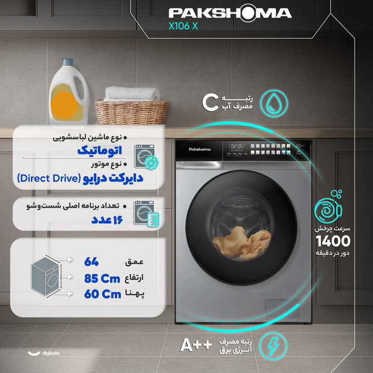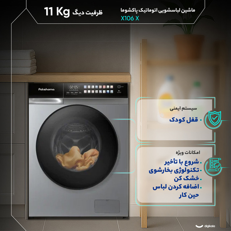 ماشین لباسشویی 11 کیلوگرم اتوماتیک پاکشوما مدل X106 X یک گزینه قدرتمند برای خانوادههای پرجمعیت است و با ظرفیت ۱۱ کیلوگرم، امکان شستوشوی حجم زیادی از لباسها، پتوهای سبک و اقلام حجیم را در یک چرخه فراهم میکند. موتور دایرکتدرایو با انتقال مستقیم نیرو، علاوه بر کاهش استهلاک و مصرف انرژی، صدای دستگاه را به ۵۴ دسیبل محدود کرده و عملکردی آرام و پایدار ارائه میدهد. سرعت چرخش ۱۴۰۰ دور در دقیقه قدرت آبگیری بالایی ایجاد میکند و باعث میشود لباسها با رطوبت کمتر وارد مرحله خشککن شوند. رده انرژی A++ و رده مصرف آب C نشاندهنده تعادل مطلوب بین مصرف و کارایی است. در بخش امکانات، ماشین لباسشویی 11 کیلوگرم اتوماتیک پاکشوما مدل X106 X از ۱۶ برنامه اصلی شستوشو و ۵ آپشن کمکی بهره میبرد که طیف کاملی از نیازهای روزمره و تخصصی را پوشش میدهد. برنامههایی همچون شستوشوی سریع ۱۵ دقیقهای، آبکشی + چرخش، و حالت آنتیآلرژی، شستوشوی لباسهای روزانه و پارچههای حساس را راحـتتر میکند. وجود تکنولوژی بخارشوی، حذف چروک اضافی و از بین بردن باکتریها را بهبود میبخشد و قابلیت اضافهکردن لباس در حین کار، کاربر را از توقف کامل چرخه بینیاز میکند. قابلیت شروع با تأخیر، قفل کودک، خشککن و نمایشگر دیجیتال نیز کنترل دستگاه را دقیقتر و هوشمندتر میکند. در بخش طراحی، ماشین لباسشویی 11 کیلوگرم اتوماتیک پاکشوما مدل X106 X با بدنه آلومینیومی مقاوم، درب از جلو با باز شدن به سمت چپ و طراحی دیگ استیل ضدزنگ الماسه ساخته شده است. این ساختار از آسیب دیدن الیاف جلوگیری میکند و کیفیت شستوشو را افزایش میدهد. کنترل ترکیبی لمسی و چرخشی استفاده از دستگاه را سادهتر میکند و ابعاد ۸۵ × ۶۰ × ۶۴ سانتیمتری، امکان نصب آسان دستگاه را در فضاهای استاندارد فراهم میسازد. این مدل با ظرفیت بالا، موتور قدرتمند و امکانات حرفهای، انتخابی مناسب برای خانوادههایی است که به شستوشوی حجم زیاد و عملکرد مطمئن نیاز دارند.