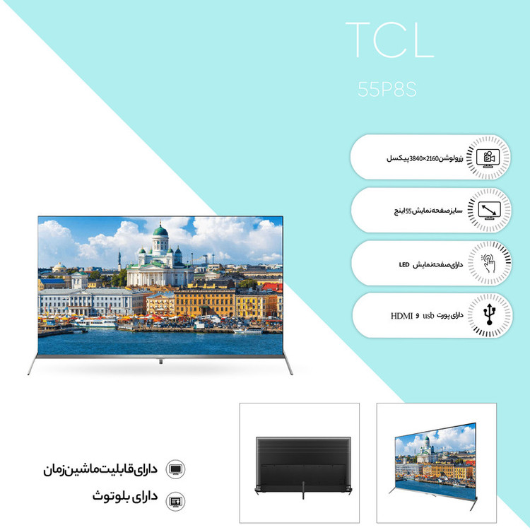 تلویزیون «55P8S» از محصولات برند «تی سی ال» (TCL) است که متناسب با نیاز طیف وسیعی از مشتریان، تولید و روانهی بازار شده است. این مدل یک تلویزیون هوشمند است. این محصول با ابعاد 55 اینچی، متناسب با سالنهای متوسط ساخته شده است. میتوانید این محصول را بهوسیلهی پایهی آن، روی میز تلویزیون قرار داده یا برای استفادهی بیشتر از محیط اتاق، به دیوار متصل کنید. برای توضیح راجعبه مشخصات این مدل باید گفت که تکنولوژی بهکاررفته در صفحهی این محصول، همانند تلویزیونهای مدرن LED است. کیفیت تصویر این مدل 4K است که در صفحهای تخت نمایش داده میشود؛ بهعلاوه این مدل قادر است کیفیت تصویر را ارتقا داده و خیالتان را بابت فیلمها و برنامههای قدیمیتر آرشیوتان راحت کند. رزولوشن 3840 × 2160 پیکسلی این تلویزیون با ابعاد آن متناسب است و تصویری مناسب را به نمایش میگذارد. بنا به سلیقهی خود، میتوانید یکی از حالتهای تصویر را انتخاب کرده و از تماشای آن لذت ببرید؛ همچنین زاویهی گستردهی دید این مدل، به شما این امکان را میدهد که بتوانید بهراحتی در حالتهای مختلف به آن نگاه کنید. این مدل برای سهولت کار کاربران، به درگاه USB و HDMI مجهز است که امکان اشتراکگذاری فایلهای متنوع را فراهم میکند. این محصول شرکت تی سی ال دارای طراحی بسیار باریک و زیبایی است که بر ارزش خرید آن افزوده است.