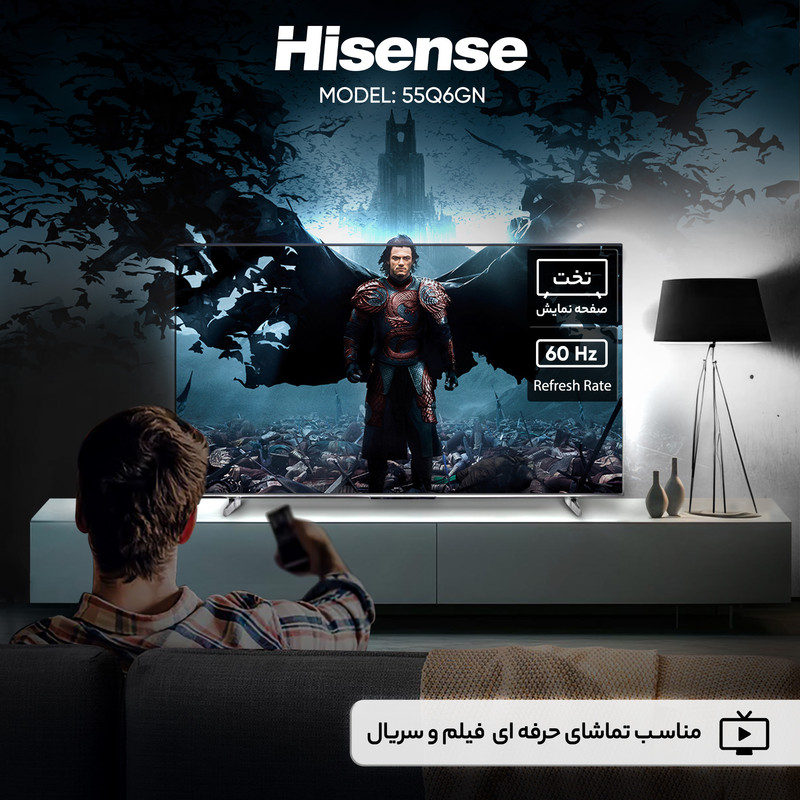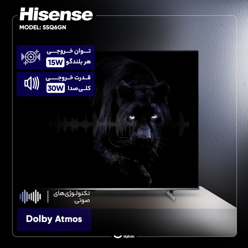 تلویزیون هوشمند هایسنس مدل 55Q6GN یک دستگاه ۵۵ اینچ با فناوری QLED است که برای ارائه تجربه تماشای با کیفیت و هوشمند طراحی شده است. کیفیت تصویر ۴K با رزولوشن 2160*3840 و پشتیبانی از Dolby Vision، رنگهای زنده و کنتراست عمیقی را فراهم میکند. استفاده از پنل VA تضمینکننده عمق بالای رنگ مشکی است که برای تماشای فیلم در محیطهای کمنور مناسب خواهد بود. این تلویزیون مجهز به سیستمعامل Android 12 و پردازنده چهار هستهای است که دسترسی آسان و سریع به اپلیکیشنها و خدمات اینترنتی را فراهم میسازد. قابلیتهای هوشمند مانند قابلیت اتصال به اینترنت، Time Shift و ضبط برنامه (PVR) از امکانات مهم آن است. توان خروجی کلی صدا ۳۰ وات است و پشتیبانی از فناوری Dolby Atmos، صدای فراگیر و با کیفیتی را ارائه میدهد.از نظر اتصالات، چهار پورت HDMI 2.0 و دو پورت USB 2.0 به همراه گیرنده دیجیتال داخلی (DVB-T2) نیازهای کاربران را برآورده میکند. نرخ بهروزرسانی ۶۰ هرتز برای تماشای محتوای روزمره استاندارد است. با وزن ۱۱.۶ کیلوگرم (با پایه) و طراحی تخت، این مدل ترکیبی از کیفیت تصویر، قابلیتهای هوشمند و صدای خوب را ارائه میدهد.