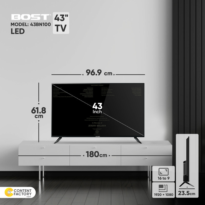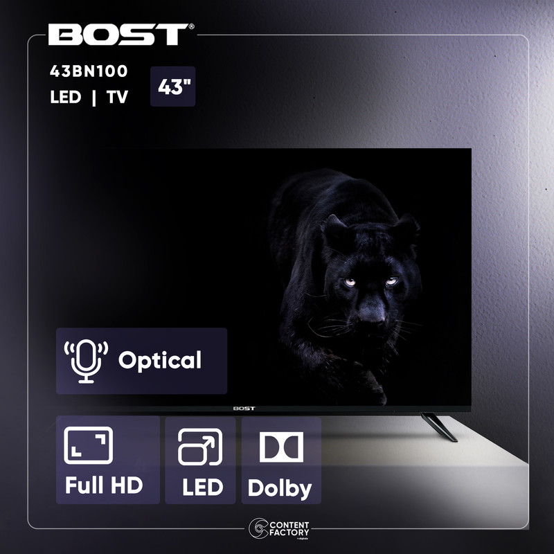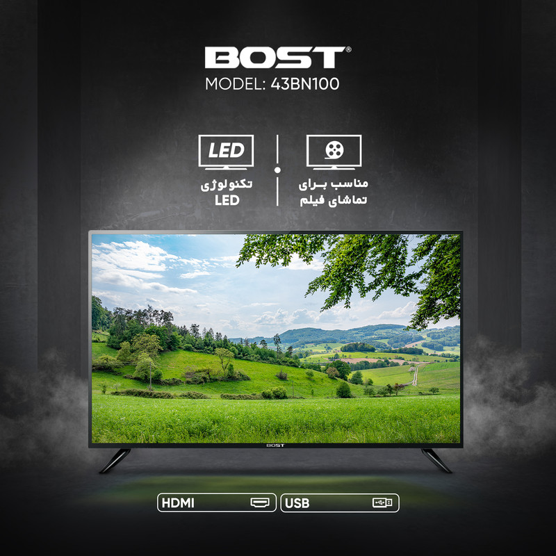 تلویزیون مدل 43BN100 محصولی از برند بست (Bost) است که با سایز 43 اینچ به بازار عرضه شده است. این تلویزیون از تکنولوژی LED برخوردار است. رزولوشن تصویر تلویزیون 43BN100 برابر با 1080 در 1920 پیکسل است که در رده Full HD قرار میگیرد. این تلویزیون دارای 2 درگاه USB است که میتوان از طریق آن فایلهای صوتی و تصویری را از طریق فلش و هارد اکسترنال روی تلویزیون اجرا کرد و یا برنامههای تلویزیونی را روی آنها ذخیره کرد. این تلویزیون همچنین از 3 درگاه HDMI هم بهره میبرد که میتوان از طریق آن لپتاپ و کنسول بازی را هم به آن متصل کرد. سیستم صوتی تلویزیون دو کاناله است و توان خروجی کلی آن برابر با 20 وات است. گیرنده دیجیتال داخلی، شما را از خرید یک دستگاه جداگانه معاف میسازد و میتوانید از شبکههای دیجیتالی صداوسیما بهراحتی استفاده کنید.