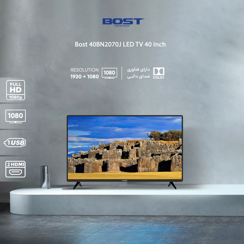 تلویزیون ال ای دی بست مدل BN2070J سایز 40 اینچ یکی از محصولات برند بست است که به بازار عرضه شده و برای کاربرانی که استفادهی حرفهای از تلویزیون ندارند، گزینهی خوبی به حساب میآید. این مدل با ابعاد 40 اینچی، برای سالنهایی با مساحت کم یا متوسط مناسب است. بلندگوهای این مدل در مجموع دارای 16 وات قدرت خروجی هستند که این میزان صدا در مقایسه با سایز این مدل، مناسب است. یعنی هر کدام از بلندگوها 8 وات توان خروجی صدا دارند .پخش صدا با فرمت Dolby Digital و Surround در این تلویزیون پشتیبانی میشود. برای توضیح در رابطه با درگاههای ارتباطی این محصول، باید گفت که این تلویزیون به پورت USB مجهز است که با آن میتوانید فلشمموری یا هارداکسترنال خود را به تلویزیون متصل کرده و از فایلهای موجود در آنها استفاده کنید. علاوه بر آن پورت HDMI برای اتصال به سایر دستگاههای صوتیوتصویری درنظر گرفته شده است. از طریق پورت HDMI، میتوان تصاویر با کیفیتتری از دستگاه پخش به تلویزیون منتقل کرد. این تلوزیون، به جدیدترین نسل گیرندهی دیجیتال داخلی DVBT2 مجهز است که میتواند تمامی شبکههای دیجیتالی HD و SD را دریافت و پخش کند. این امر باعث میشود تا به تهیهی یک دستگاه جداگانه نیازی نباشد. قابلیت ماشین زمان (Time Shift) ، ضبط برنامه های تلویزیونی PVR و داشتن راهنمای الکترونیکی برنامههای تلویزیونی EPG از دیگر امکانات این دستگاه هستند. کیفیت Full HD این تلویزیون برای مصرف روزمره مناسب است و تصویر با کیفیت و مناسبی را در اختیار شما قرار میدهد.