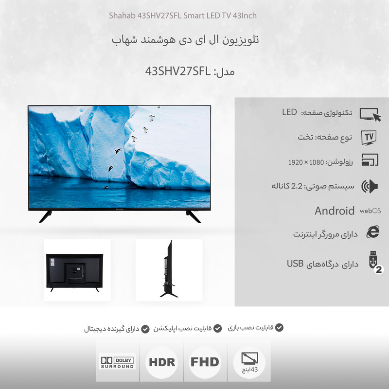 تلویزیون مدل «43SHV27SFL» از محصولات برند «شهاب» است که در سایز 43 اینچ تولید و روانه بازار شده است. این تلویزیون از تکنولوژی LED برخوردار است و با نمایش تصویری با کیفیت FHD، نیاز مخاطبان را برطرف میکند. در این مدل، دو پورت USB تعبیه شده است و برای شما این امکان را فراهم میکند که فایلهای خود را با آن به اشتراک بگذارید و از گزینههای بیشتری برخوردار باشید. همچنین ورودیهای HDMI این تلویزیون، باعث میشود تا بتوانید سایر لوازم صوتی و تصویری را به تلویزیون خود متصل کرده و تصاویر را با کیفیت بالاتری انتقال دهید. این تلویزیون به سیستم عامل اندروید مجهز شده است و میتوانید برنامههای مورد نظر خود را دانلود و یا از طریق درگاه USB تلویزیون نصب کنید. این تلویزیون از فرمتهای رایج صوتی و تصویری پشتیبانی میکند تا کاربران بتوانند از فایل خود بهراحتی استفاده کنند. اگر میخواهید با صرف هزینه کمتر تلویزیونی با امکانات زیاد را برای فضاهای متوسط و کوچک داشته باشید، تلویزیون 43SHV27SFL شرکت شهاب را بهعنوان یکی از انتخابهای خود مدنظر قرار دهید.