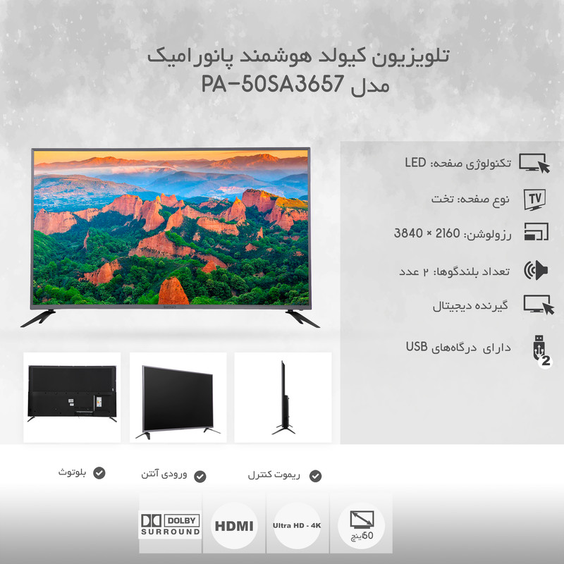 تلویزیون مدل PA-50SA3657 محصولی از برند پانورامیک (Panoramic) است که با سایز 50 اینچ به بازار عرضه شده است. این تلویزیون هوشمند است و بهصورت پیشفرض از اندروید نسخه 7.1.1 بهره میبرد. برای این مدل از برند پانورامیک، یک پردازنده مرکزی 8 هستهای در نظر گرفته شده است. تصویرتلویزیون PA-50SA3657 با کیفیت تصویر Ultra HD - 4K است. این تلویزیون دارای دو درگاه USB است که میتوان از طریق آن فایلهای صوتی و تصویری را از طریق فلش و هارد اکسترنال روی تلویزیون اجرا کرد و یا برنامههای تلویزیونی را روی آنها ذخیره کرد. این تلویزیون همچنین از درگاههای کامپوننت، کامپوزیت و 3 درگاه HDMI هم بهره میبرد که بسیار کاربردی است. سیستم صوتی تلویزیون دو کاناله است و توان خروجی کلی آن برابر با 20 وات است. گیرنده دیجیتال داخلی، شما را از خرید یک دستگاه جداگانه معاف میسازد و میتوانید از شبکههای دیجیتالی صداوسیما بهراحتی استفاده کنید. برای سهولت در استفاده از این مدل، به همراه آن یک عدد ریموت کنترل هوشمند ارائه میشود. بهرهگیری از صفحهنمایش Ultra HD - 4K، فناوری HDR10+ و قابلیت ارتباط بدون سیم DLNA، Mirroring و AirPlay به ارزش خرید این محصول افزوده است. این محصول بهجز ریموت کنترل اصلی، یک ریموت کنترل جادویی (مجیک) هم دارد که فقط با یک دکمه تبدیل به موس میشود تا کاربر بتواند با تکان دادن ریموتکنترل، کلیک کند و با استفاده از کیبورد پشت آن هم بهراحتی تایپ کند.