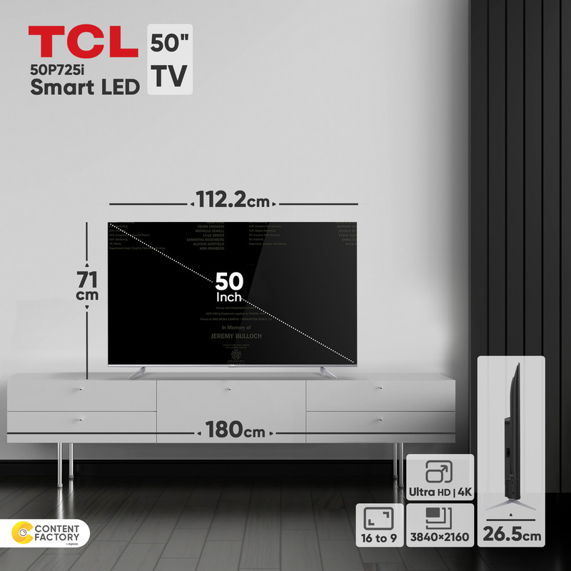 تلویزیون ال ای دی هوشمند تی سی ال مدل 50P725i سایز 50 اینچ محصولی بادوام و خوشساخت و باکیفیت از این برند است که امکانات متعددی را در اختیار کاربرانش میگذارد. کیفیتتصویر این تلویزیون ULTRA HD 4K است و تصاویر را با وضوح و شفافیت بسیار بالایی نمایش میدهد. زاویهدید 178 درجه و وسیعی دارد و امکان تماشای صفحه نمایش را از محدودهی وسیعی فراهم میکند. نسبت تصویر آن 16:9 است و تصویر را با ابعاد متناسبی پخش میکند. سیستمصوتی تلویزیون 50P725i دوکاناله است و با کمک دو بلندگوی 12 وات، در مجموع 24 وات صدا تولید میکند. شرکت تی سی ال برای این مدل، دو عدد درگاه USB در نظر گرفته شده است. با استفاده از این 2 پورت میتوانید فلشمموری و هارد اکسترنال خود را به تلویزیون متصل کرده و از فایلهای موجود در آنها استفاده کنید. برای اتصال پخشکنندهها به این تلویزیون میتوانید از بین درگاههای HDMI، کامپوزیت و کامپوزیت یکی را انتخاب کنید. درگاه HDMI قادر است تصاویر را با کیفیت بالا به صفحهنمایش منتقل کند. تلویزیون ال ای دی هوشمند تی سی ال مدل 50P725i سایز 50 اینچ دارای سیستمعامل اندروید 9 بوده و وجود گیرندهی دیجیتال داخلی، شما را از خرید یک دستگاه جداگانه معاف میکند بنابراین میتوانید از شبکههای دیجیتالی صداوسیما بهراحتی استفاده کنید.