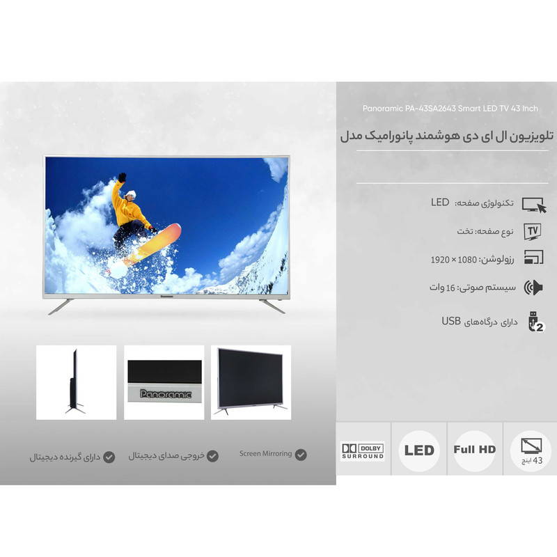 تلویزیون مدل PA-43SA2643 محصولی از برند پانورامیک (Panoramic) است که با سایز 43 اینچ به بازار عرضه شده است. تصویرتلویزیون PA-43SA2643 با کیفیت تصویر FULL-HD است. این تلویزیون هوشمند است و بهصورت پیشفرض از اندروید نسخه 7.1.1 بهره میبرد. این تلویزیون دارای دو درگاه USB است که میتوان از طریق آن فایلهای صوتی و تصویری را از طریق فلش و هارد اکسترنال روی تلویزیون اجرا کرد . این تلویزیون همچنین از درگاههای کامپوننت،اپتیکال و 2 درگاه HDMI هم بهره میبرد که بسیار کاربردی است. درگاه USB امکان اتصال فلش مموری و هارد اکسترنال را به دستگاه میدهد. گفتنی است این دستگاه مجهز به PVR است که امکان ضبط برنامه های تلویزیونی را به کاربر میدهد. گیرنده دیجیتال داخلی، شما را از خرید یک دستگاه جداگانه معاف میسازد و میتوانید از شبکههای دیجیتالی صداوسیما بهراحتی استفاده کنید.