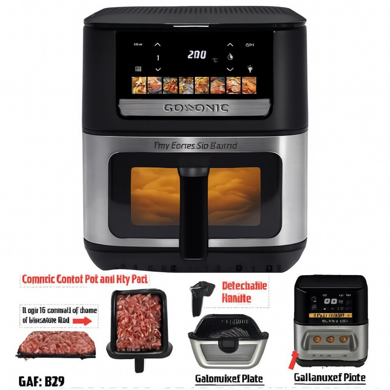 سرخکن بدون روغن گوسونیک مدل GAF-879 با ظرفیت ۹ لیتر، انتخابی حرفهای و کاربردی برای آشپزخانههای مدرن است. این دستگاه با طراحی زیبا، عملکرد قدرتمند و فضای داخلی بزرگ، امکان پخت انواع غذاهای خوشمزه را بدون نیاز به روغن فراهم میکند. توان مصرفی ۲۱۰۰ وات با دو المنت مجزا (۱۶۰۰ وات بالا و ۵۰۰ وات پایین) باعث پخت یکنواخت و سریع غذا میشود. فناوری گردش هوای Fry Force 360° به شما کمک میکند تا غذاهایی طلایی، ترد و سالم آماده کنید. نمایشگر دیجیتال لمسی با قابلیت تنظیم دما تا ۲۰۰ درجه سانتیگراد و ۸ برنامه پخت از پیشتنظیمشده، کنترل کامل فرآیند پخت را در اختیار شما قرار میدهد. قابلمه و سبد با پوشش سرامیکی، دسته قابل جدا شدن، قابلیت پخت همزمان دو لایه غذا، چراغ داخلی، سیستم محافظت در برابر داغ شدن بیش از حد و محفظه داخلی تمام فلزی از دیگر ویژگیهای این محصول هستند. سرخکن GAF-879 با ظرفیت بالا و امکانات