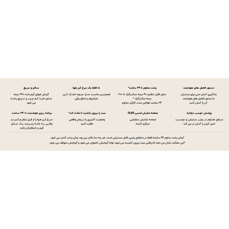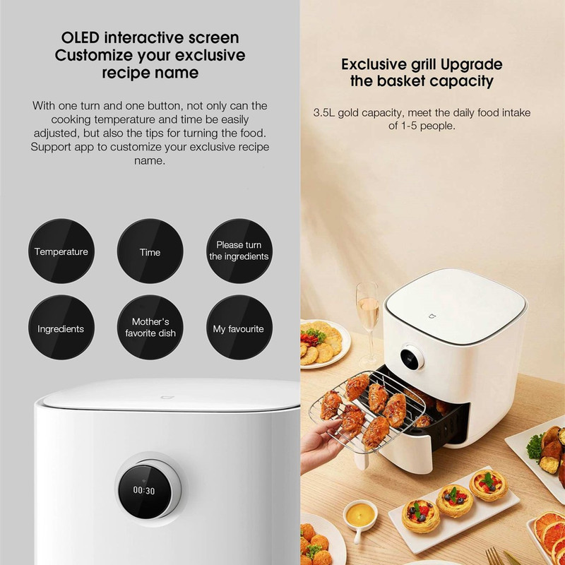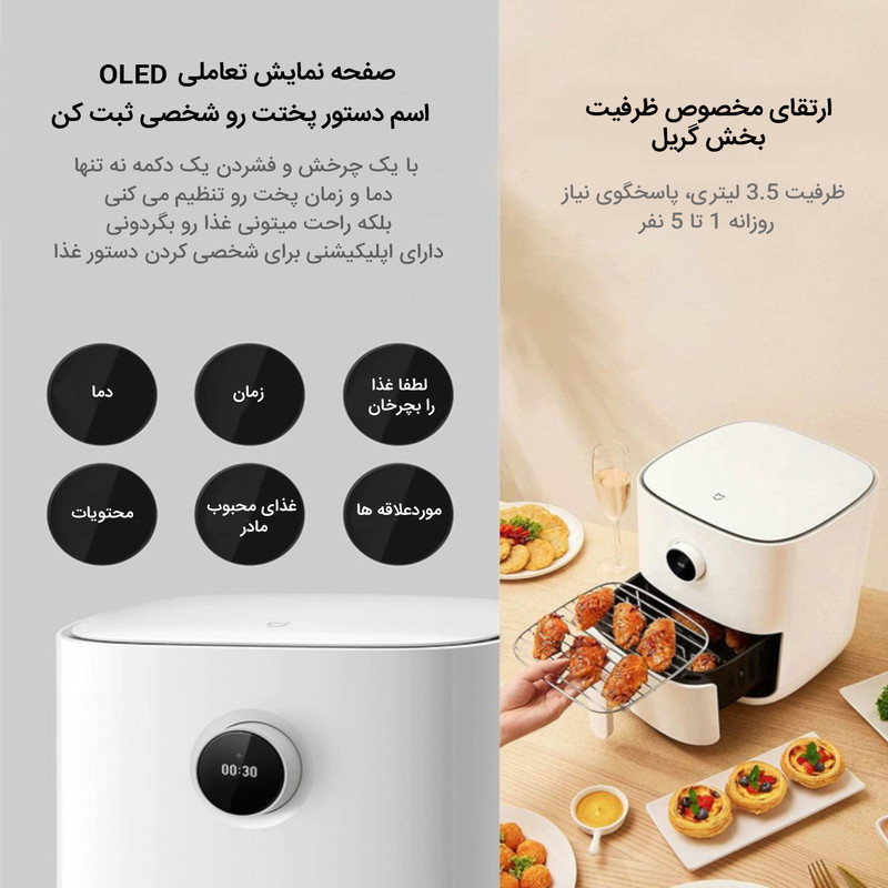 امروزه افراد بسیاری با استفاده از غذاهای سرخ کردنی سلامت خود را به خطر انداخته و به فکر رژیم غذایی خود نیستند. غذاهای سرخکردنی یکی از معضلاتی است که بشر امروزی با آن روبهرو است. غذاهایی که به شدت خوشمزه هستند، اما در این حال برای بدن مضرر هستند. از این رو، افرادی زیادی برای دوری از آفت بیماریهایی مانند کبد چرب یا چاقی به سراغ رژیم با غذاهای بدون روغن رفتهاند. هواپز شیائومی مدل MAF02 یک دستگاه راحت برای پخت انواع غذاهای گوناگون بدون روغن است. شما میتوانید انواع غذاها را به وسیله این دستگاه طبخ کنید. این دستگاه دارای توان مصرفی 1500 وات بوده و جنس ظروف آن از دو لایه PTFE کامپوزیت هفت لایه با روکش ساخته شده تا غذا به آن نچسبد. همچنین این محصول شیائومی قابلیت اتصال به اپلیکیشن Mi Home را دارد که شما میتوانید آن را از راه دور کنترل کنید و در کمترین زمان غذای خود را بپزید.
