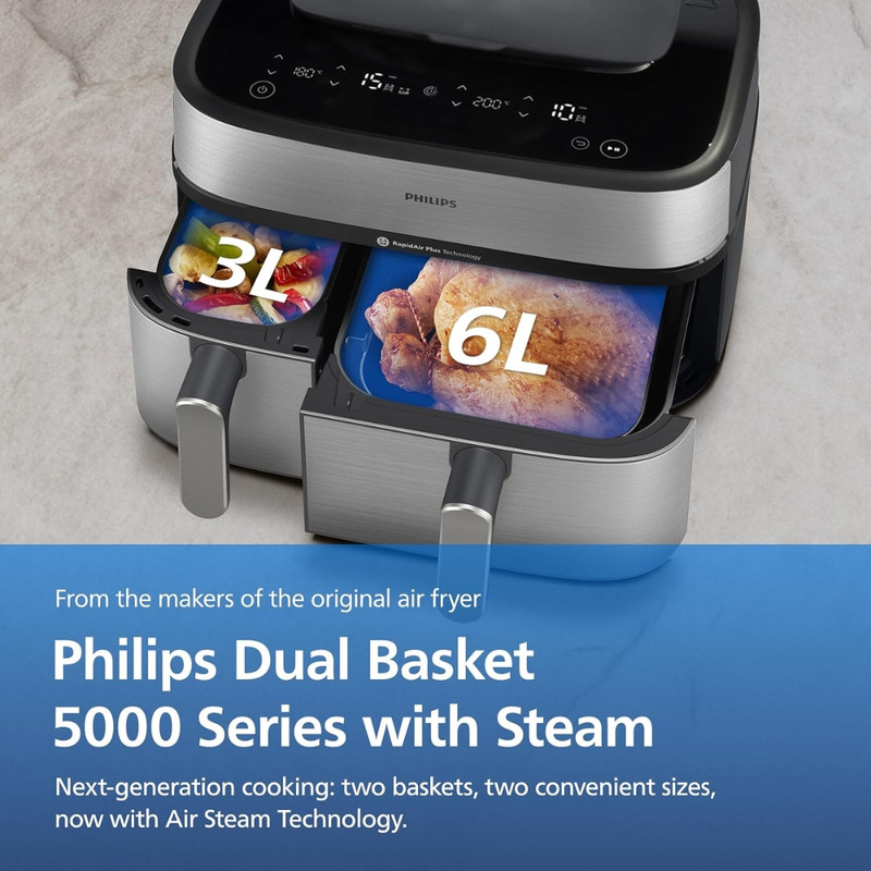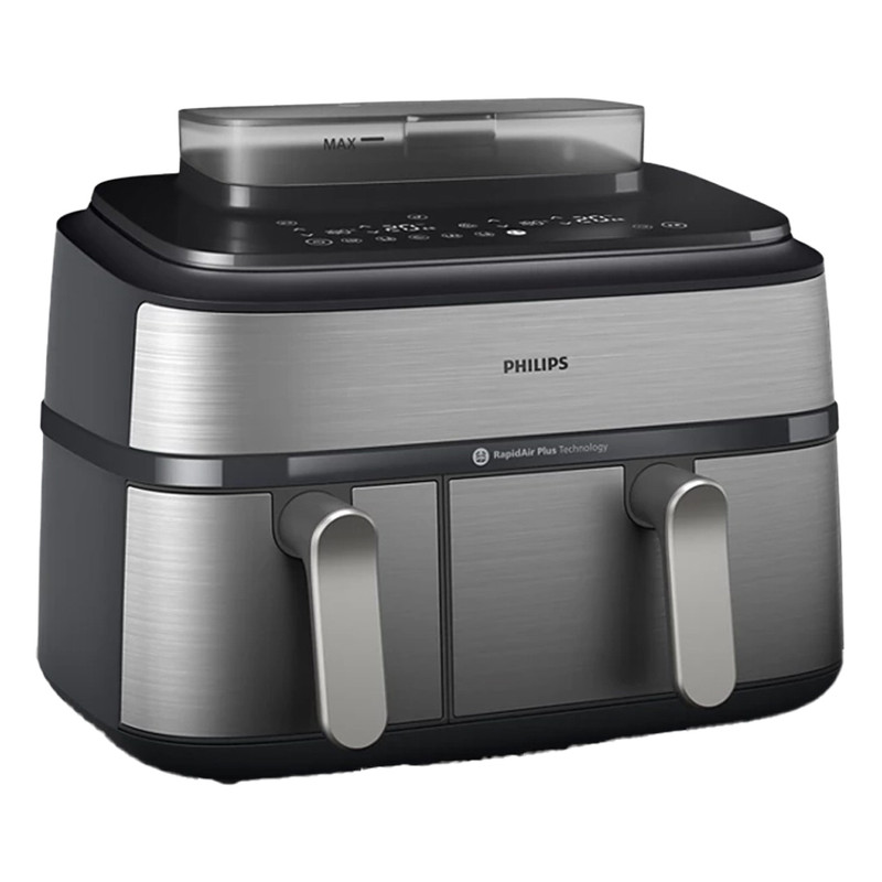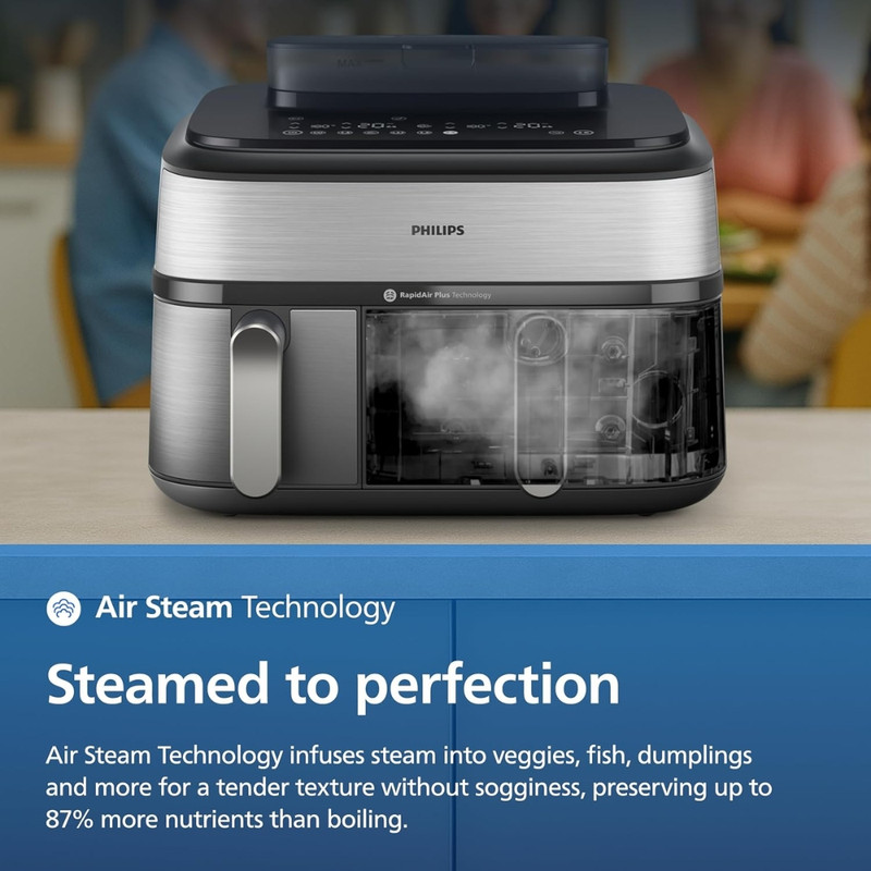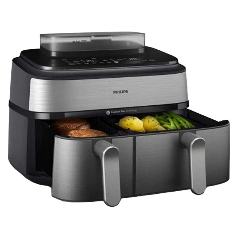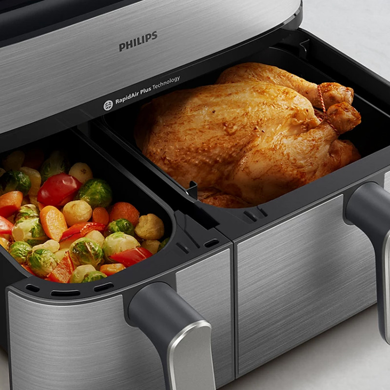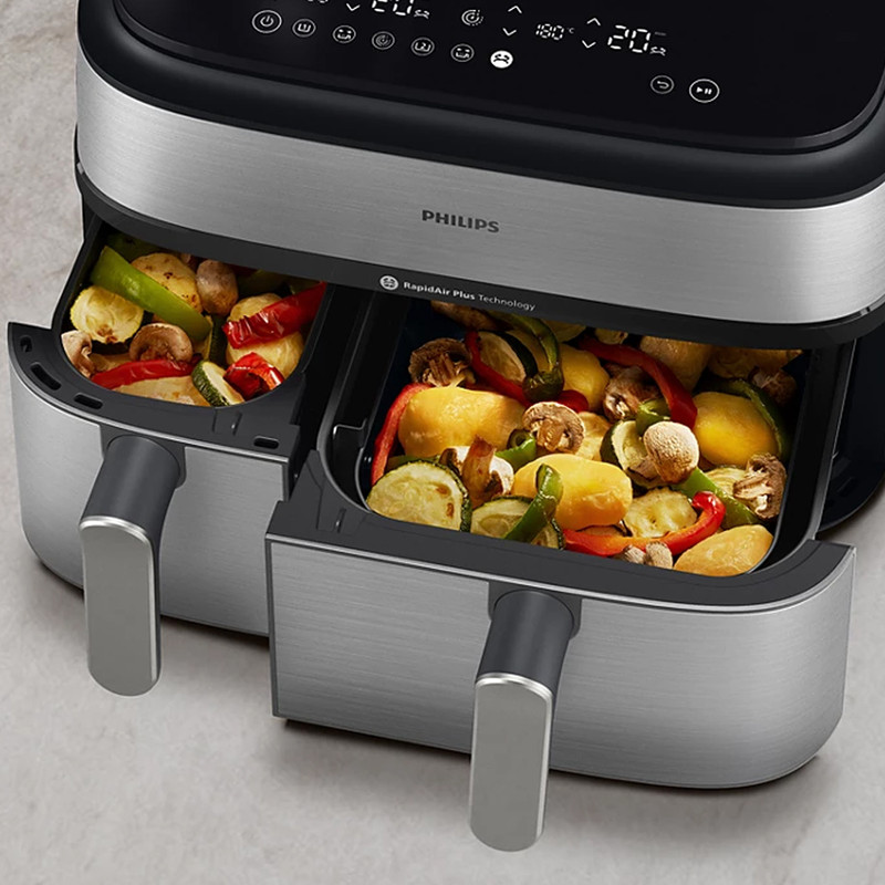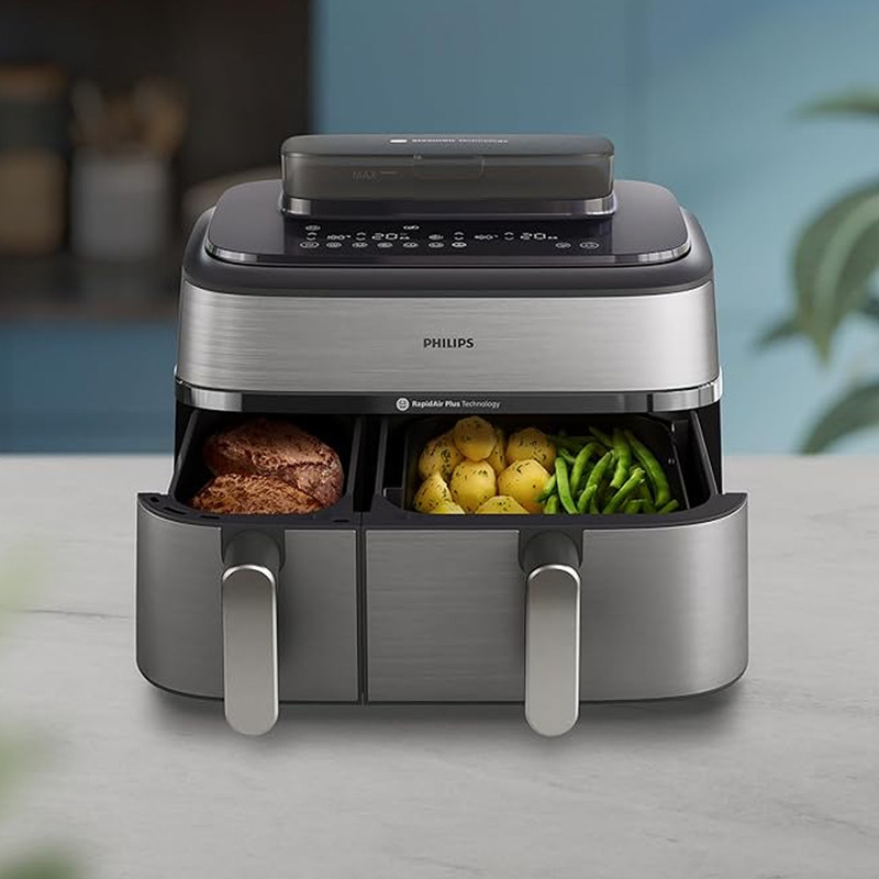 در بخش عملکرد، هواپز 9 لیتر فیلیپس مدل NA555/09 از فناوریهای پیشرفته RapidAir Plus و Air Steam بهره میبرد که ترکیب جریان هوای گرم با بخار را ممکن میسازد. این ساختار نهتنها باعث پخت یکنواخت و سریعتر میشود، بلکه رطوبت داخلی غذا را حفظ کرده و از خشک شدن گوشت، ماهی یا سبزیجات جلوگیری میکند. دستگاه دارای دو سبد مجزا شامل یک سبد ۶ لیتری و یک سبد ۳ لیتری است که امکان پخت دو نوع غذا را بهصورت همزمان و با تنظیم دما و زمان مستقل برای هر محفظه فراهم میسازد. یکی از سبدها مجهز به قابلیت بخارپز است و این ویژگی برای افرادی که به تغذیه کمچرب و سالم اهمیت میدهند بسیار ارزشمند است. وجود ۱۲ برنامه پخت پیشفرض نیز فرآیند آمادهسازی غذاهای متفاوت را سادهتر و سریعتر میکند.