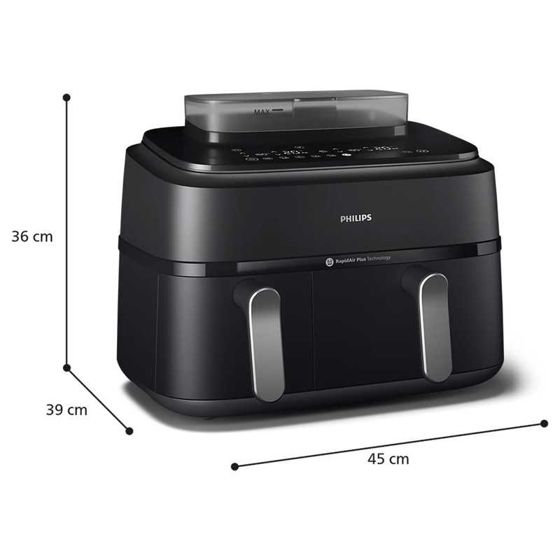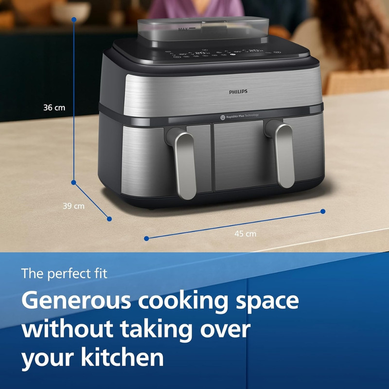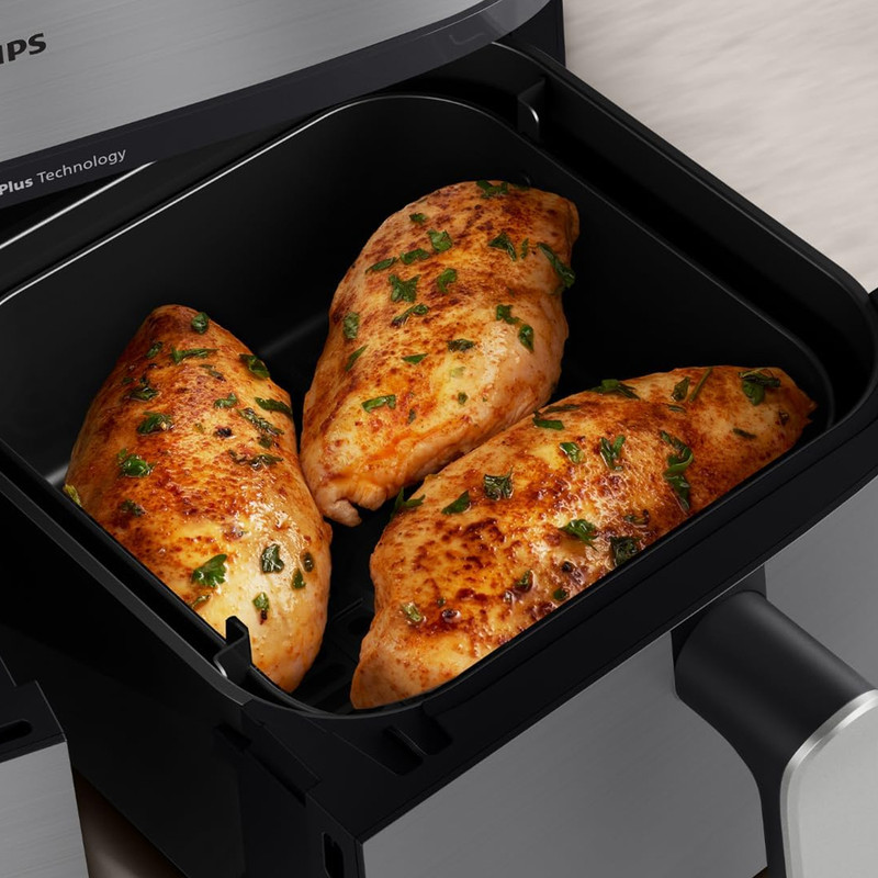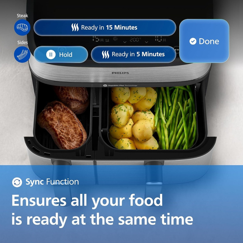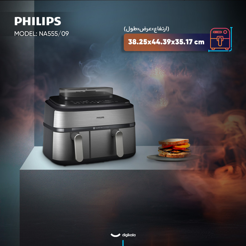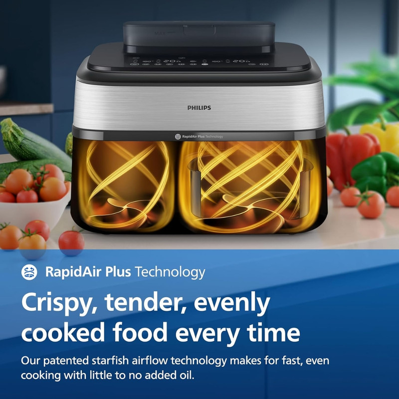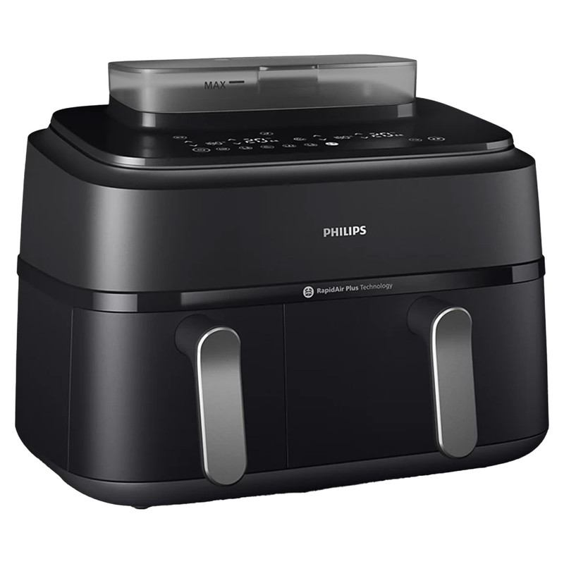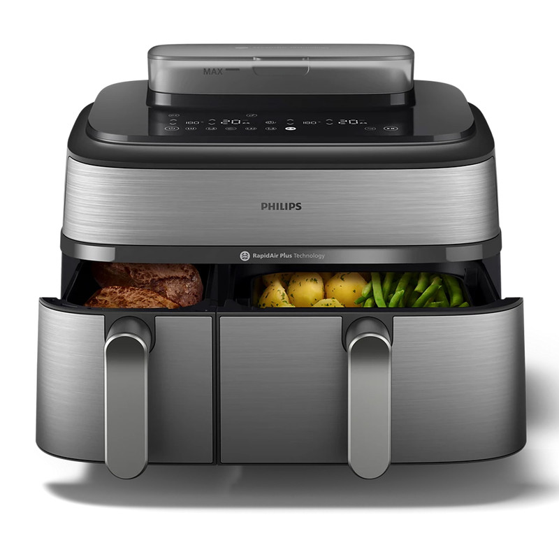 در بخش عملکرد، هواپز 9 لیتر فیلیپس مدل NA555/09 از فناوریهای پیشرفته RapidAir Plus و Air Steam بهره میبرد که ترکیب جریان هوای گرم با بخار را ممکن میسازد. این ساختار نهتنها باعث پخت یکنواخت و سریعتر میشود، بلکه رطوبت داخلی غذا را حفظ کرده و از خشک شدن گوشت، ماهی یا سبزیجات جلوگیری میکند. دستگاه دارای دو سبد مجزا شامل یک سبد ۶ لیتری و یک سبد ۳ لیتری است که امکان پخت دو نوع غذا را بهصورت همزمان و با تنظیم دما و زمان مستقل برای هر محفظه فراهم میسازد. یکی از سبدها مجهز به قابلیت بخارپز است و این ویژگی برای افرادی که به تغذیه کمچرب و سالم اهمیت میدهند بسیار ارزشمند است. وجود ۱۲ برنامه پخت پیشفرض نیز فرآیند آمادهسازی غذاهای متفاوت را سادهتر و سریعتر میکند.