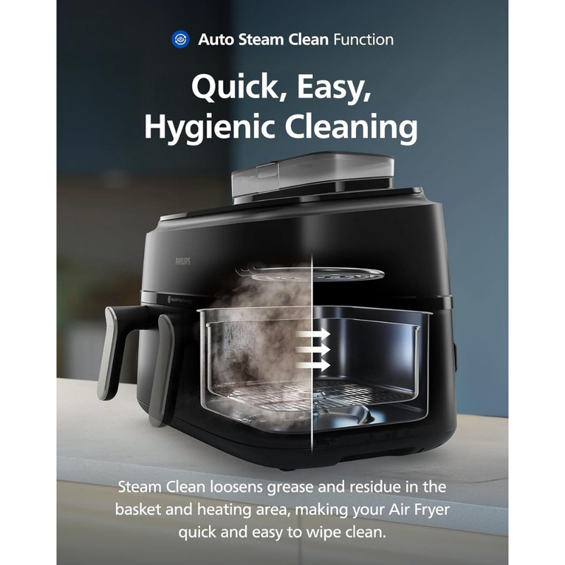 در بخش نظافت، هواپز 9 لیتر فیلیپس مدل NA555/09 به قابلیت Auto Steam Clean مجهز است که با تولید بخار داغ، چربیهای باقیمانده را نرم و تمیز کردن دستگاه را بسیار آسان میکند. همچنین تمامی اقلام جانبی قابل شستوشو در ماشین ظرفشویی هستند. این مدل گزینهای عالی برای آشپزی سریع، سالم و حرفهای در خانه است.
