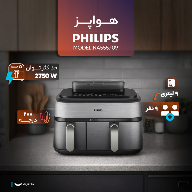هواپز 9 لیتر فیلیپس مدل NA555/09 یک دستگاه چندکاره و قدرتمند برای آشپزی سالم و سریع است و با ظرفیت ۹ لیتری، نیاز خانوادههای پرجمعیت یا کاربرانی که بهدنبال پخت همزمان چند نوع غذا هستند را بهطور کامل برطرف میکند. طراحی این محصول با وزن 8.8 کیلوگرم و ابعاد استاندارد، از دوام بالا و کیفیت ساخت مناسب حکایت دارد. حداکثر توان مصرفی 2750 وات در کنار محدوده دمایی 40 تا 200 درجه سانتیگراد، قدرت و انعطاف کافی برای پخت انواع غذاها را فراهم میکند. طول سیم 100 سانتیمتری نیز آزادی عمل بیشتری هنگام قرارگیری دستگاه روی کابینت یا میز آشپزخانه ایجاد میکند.