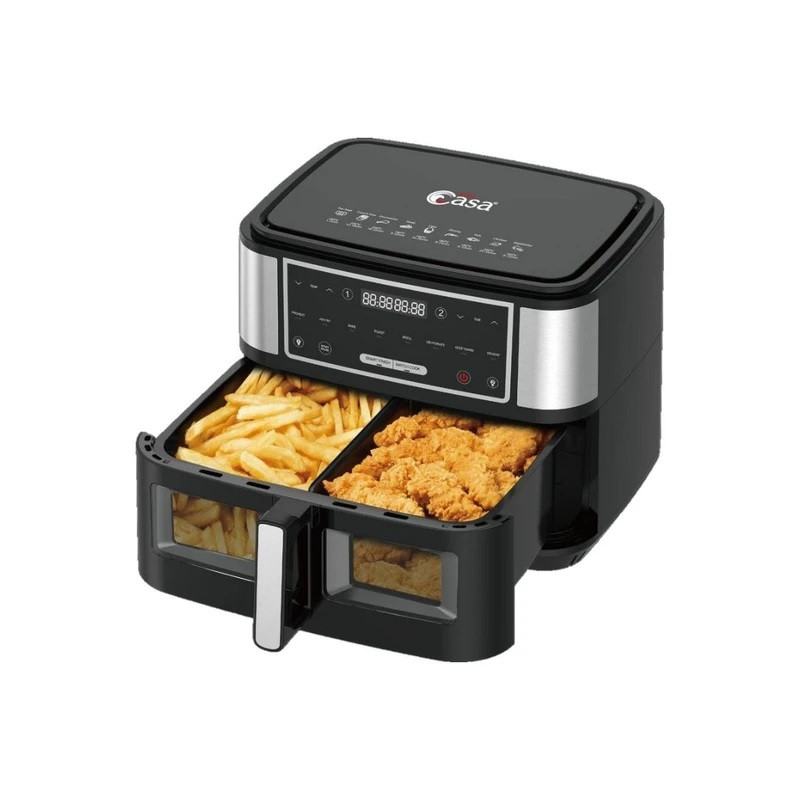 سوپر کاسا یکی از برندهای معتبر در زمینهی تولید لوازم خانگی و برقی است که چندین سال است در این حوزه فعالیت میکند. یکی از محصولات بینظیر این کمپانی، سرخ کن های بدون روغن است که در مدلهای مختلفی تولید شده است. سرخ کن های بدون روغن با تزریق هوای داغ و گردش آن در داخل محفظه، سبب آماده شدن و مغز پخت شدن غذاها میگردد. این سرخکن ها مصرف روغن را 80-90 درصد کاهش میدهند و سلامت بدن شما را برای عمری طولانی تضمین میکنند. سرخ کن بدون روغن دیجیتال دو مخزن چهار المنته مدل CA-113 یکی از محصولات کمپانی سوپر کاسا است که سبب کاهش 80 درصدی مصرف روغن شده و غذاها را با میزان مصرف بسیار پایین یا بدون روغن سالم آماده میکند. سرخ کن دارای توان مصرفی 3000 وات است که باعث آماده شدن غذاهای دلخواه شما در زمانی کوتاه میشود. گنجایش مخزن این سرخ کن 10 لیتر است که به کمک آن میتوانید دوستان یا خانواده را به صرف یک وعده غذای لذیذ دعوت نمایید. پنل کنترلی این دستگاه به صورت لمسی طراحی شده است و با یک لمس غذاهای مورد علاقهی شما را آماده میکند. سرخ کن بدون روغن دیجیتال دو مخزن چهار المنته مدل CA-113 دارای سیستم تایمر و تنظیم دما است که با تغییر آن میتوانید زمان و دمای غذای خود را تنظیم کنید. هواپز بدون روغن دیجیتال سوپر کاسا دارای طراحی بدنهی منحصر به فردی بوده که از جنس پلاستیک محکم و استیل ساخته شده و از دوام و ماندگاری بالایی برخوردار است. لازم به ذکر است در این سرخ کن قابلیت پخت همزمان دو مواد غذایی مختلف با تنظیمات مختلف وجود دارد و همچنین میتوانید حجم بالایی از مواد غذایی را در مخرن 10 لیتری سرخ کن قرار دهید و براحتی با منوهای پخت مختلف دستگاه که شامل هشت منوی پخت متنوع میباشد براحتی مواد مورد نظر را در سریع ترین زمان و سلامت ترین حالت در اختیار داشته باشید