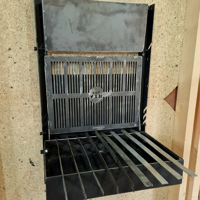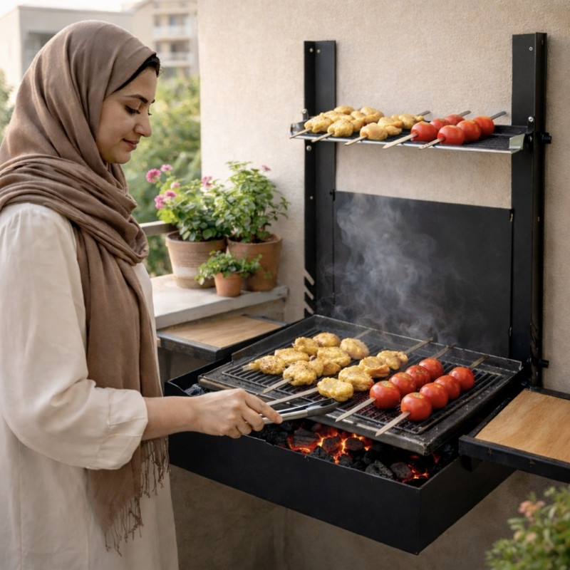 سایر اقلام همراه محصول: بدنه اصلی باربیکیو توری گریل فلزی طبقه یا ماهیتابه فلزی طبقات جانبی چوبی دو عدد متعلقات نصب دیواری