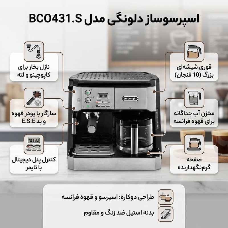 در زمانی که انتخاب یک اسپرسوساز دلونگی مانند مدل BCO431.S را در نظر دارید، مهم است تا به ویژگیها و امکانات آن دقت کنید. این دستگاه با قابلیتها و امکانات منحصر به¬فرد خود، تجربهای بینظیر از تهیه قهوه اسپرسو را فراهم میکند.