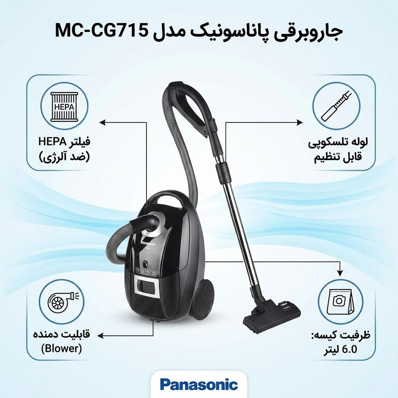 -مجهز به لوله تلسکوپی جادویی - دارای دستگیره با طراحی جدید سابر - دارای نازل دو بخشی - قابلیت تنظیم کنترل مکش متغیر - بدون امکان استفاده از کیسه یکبار مصرف - میزان صدا 65 دسیبل