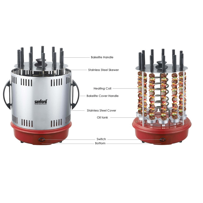 کباب پز برقی سانفورد مدل SF5950RBQ یکی از با کیفیت ترین و جدیدترین محصولات شرکت سانفورد می باشد.شرکت سانفورد تولید کننده لوازم خانگی تحت لیسانس ژاپن می باشد که به کلیه کشورهای آسیایی و اروپایی لوازم خانگی با تنوع بسیار بالا صادر می کند.این کباب پز دارای بدنه استیل بسیار باکیفیت می باشد.روش کار به این صورت می باشد که 11 سیخ مقاوم و باکیفیت خوب بصورت عمودی داخل محفضه های خود قرار گرفته و بصورت 360 درجه بصورت اتوماتیک بروی صفحه دایره ای شکل به چرخش در می آید و حرارت را از مرکز این دستگاه که المنت حرارتی بصورت عمودی و فنری شکل می باشد به غذای قرار گرفته داخل سیخ ها انتقال می دهد.این دستگاه دارای دو دسته پلاستیکی قایق حرارتی می باشند .توان این دستگاه 1500 وات می باشد و دارای موتور قوی و گیربکس فلزی بسیار بامقاوم می باشد بنابراین دارای دمای بسیار بالا جهت رست کردن سریع می باشد. همچنین قطعات این کباب پز برقی جهت شست و شو و تمیز کردن براحتی مونتاژ و دمونتاژ می شوند که تمام نگرانی های شمارا در داشتن یک کباب پز برقی کامل از بین می برد.