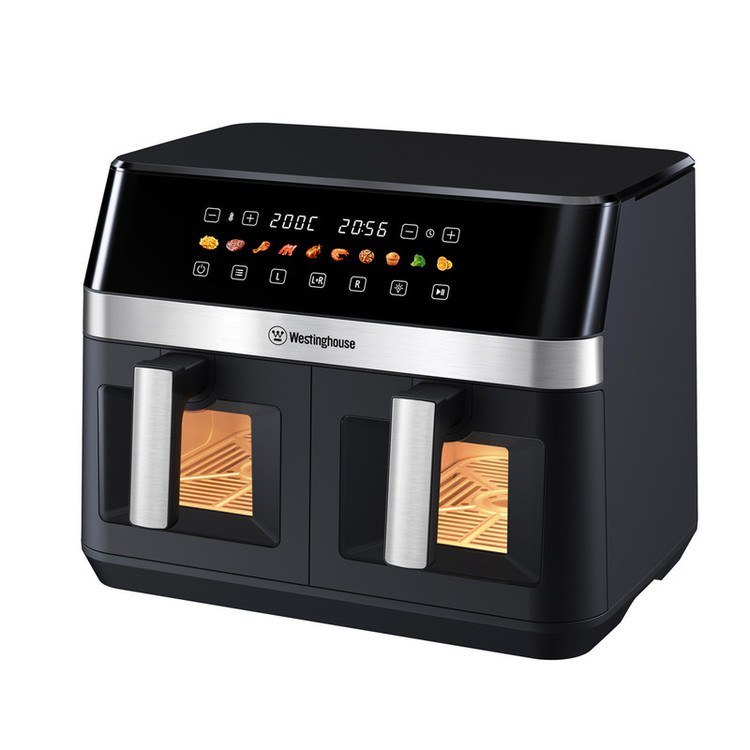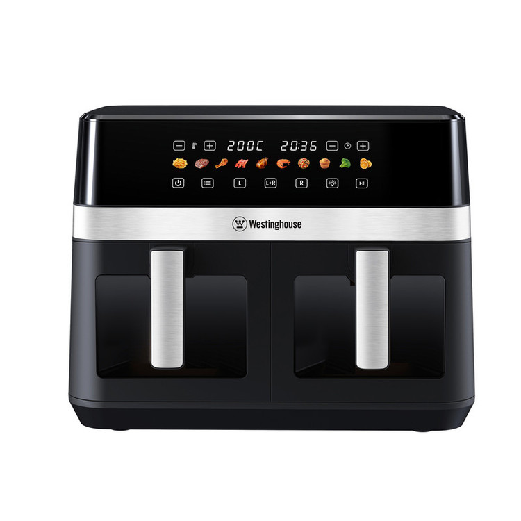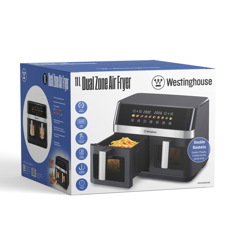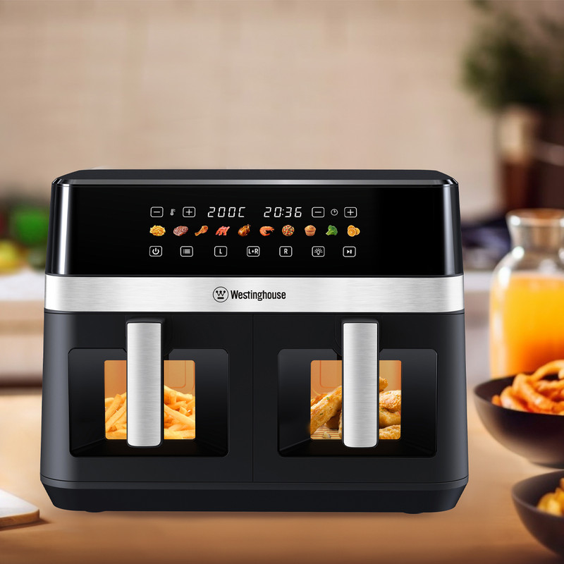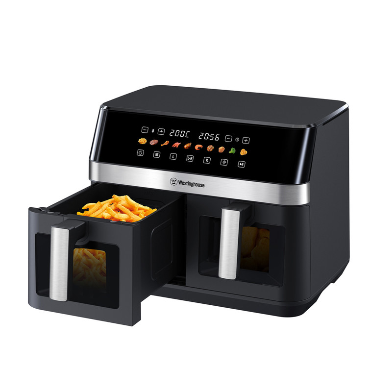 Westinghouse Dual Zone Air Fryer – 11L Capacity, 2 Independent Baskets, 10 Preset Programs, Adjustable Temperature (150°F–400°F), Dishwasher-Safe, PFOA-Free – Black