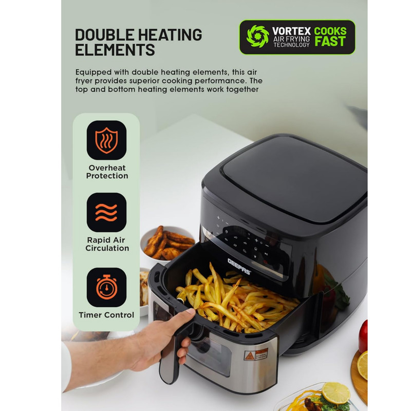 عناصر گرمایشی دوسویه: این سرخ کن هوای مجهز به المنت های گرمایشی دوگانه، پختی عالی را ارائه می دهد. سطوح حرارتی بالا و پایین برای اطمینان از توزیع یکنواخت گرما، کاهش زمان پخت و ارائه غذاهای کاملاً پخته با هم کار می کنند.