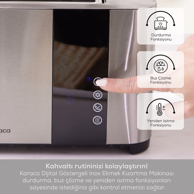 توستر Karaca Inox با نمایشگر دیجیتال به لطف صفحه نمایش لمسی مدرن و آسان برای استفاده و صفحه نمایش دیجیتال، تجربه ای کاربرپسند را ارائه می دهد.