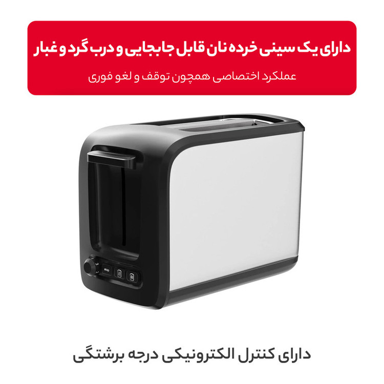 دارای كنترل الكترونيكى درجه برشتگى (7-1) مجهز به نشانگر نور بر روی دکمه ها دارای دكمه توقف / لغو عملیات دارای عملکرد گرم مجدد