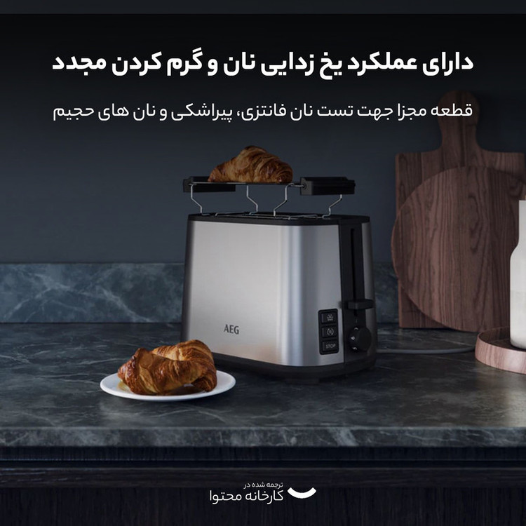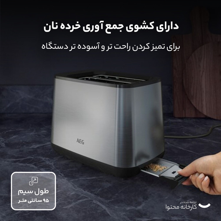 سایر توضیحات: توستر نان دو لاین آ ا گ، توان مصرفی 800 وات، دارای قطعه مجزا جهت توست نان فانتزی، پیراشکی و نان های حجیم، درجه تست نان در 7 درجه قابل تنظیم، حالت یخ زدایی نان و گرم کردن مجدد، سینی جمع آوری خرده نان جداشو و قابل شستشو،