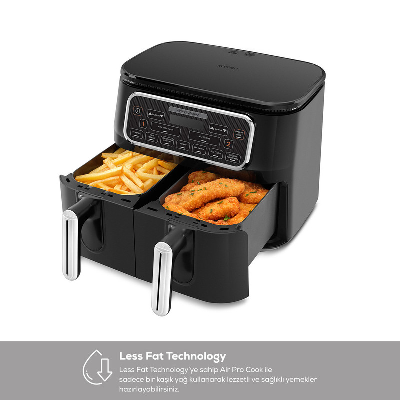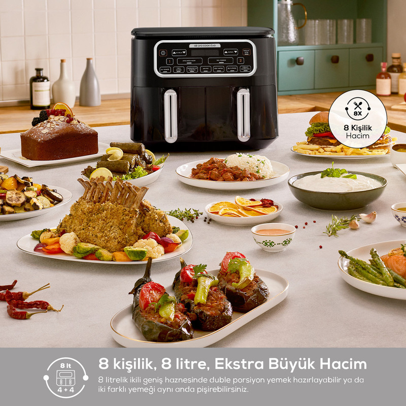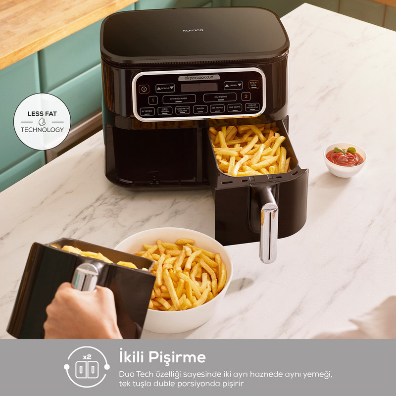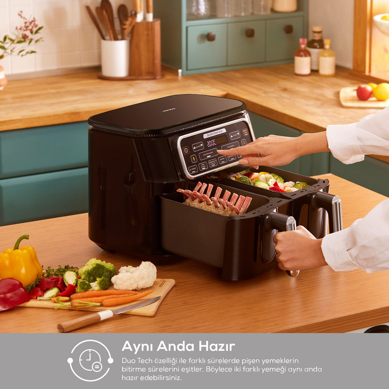 هواپز و سرخ کن دوقلو کاراجا Tandır XXXL ، دارای 8 حالت مختلف سرخ کردن ، عملکرد فر، کیک و شیرینی، خشک کردن سبزیجات و میوه، تهیه ماست خانگی ، پخت تنوری ، یخ زدایی و همچنین تنظیم دما و زمان با سلیقه شخصی، اکنون با ویژگی های کاملاً جدید خود در آشپزخانه شما قرار دارد. هواپز و سرخ کن دوقلو کاراجا Air Pro Tandır XXXL،تمام طعم ها را با تکنولوژی چربی کمتر و تنها با استفاده از یک قاشق روغن آماده می کند. با Circulation Air Tech، هر قسمت از غذای شما به طور مساوی با جریان هوای گرم از بالا به پایین پخته می شود. به لطف ویژگی Duo Tech، می توانید غذای خود را به دلخواه در 3 حالت پخت مختلف آماده کنید. با عملکرد آماده در همان زمان، می توانید غذاهای پخته شده در بازه های زمانی مختلف را در دو مخزن مختلف سرو کنید تا همزمان آماده شوند، یا با عملکرد Double Cooking، می توانید دو وعده از یک غذا را در دو قسمت بزرگ درست کنید. محفظه های XXXL 4 + 4 لیتری با یک دکمه. در صورت تمایل می توانید به صورت دستی دما و زمان را طبق دستور غذا تنظیم کنید. علاوه بر این، در حین انجام همه این کارها، بوی غذاهای پخته شده در دو مخزن مجزا با یکدیگر مخلوط نمی شود. هنگامی که می خواهید وعده های غذایی خود را دوباره گرم کنید، ویژگی Heating اجازه می دهد تا غذا به اندازه ای گرم باشد که گویی تازه پخته شده است. علاوه بر این، با Easy Wash Tech، که امکان شستشوی مخزن را در ماشین ظرفشویی فراهم می کند، می توانید انرژی خود را نه برای تمیز کردن، بلکه برای کشف دستور العمل های کاملاً جدید صرف کنید.