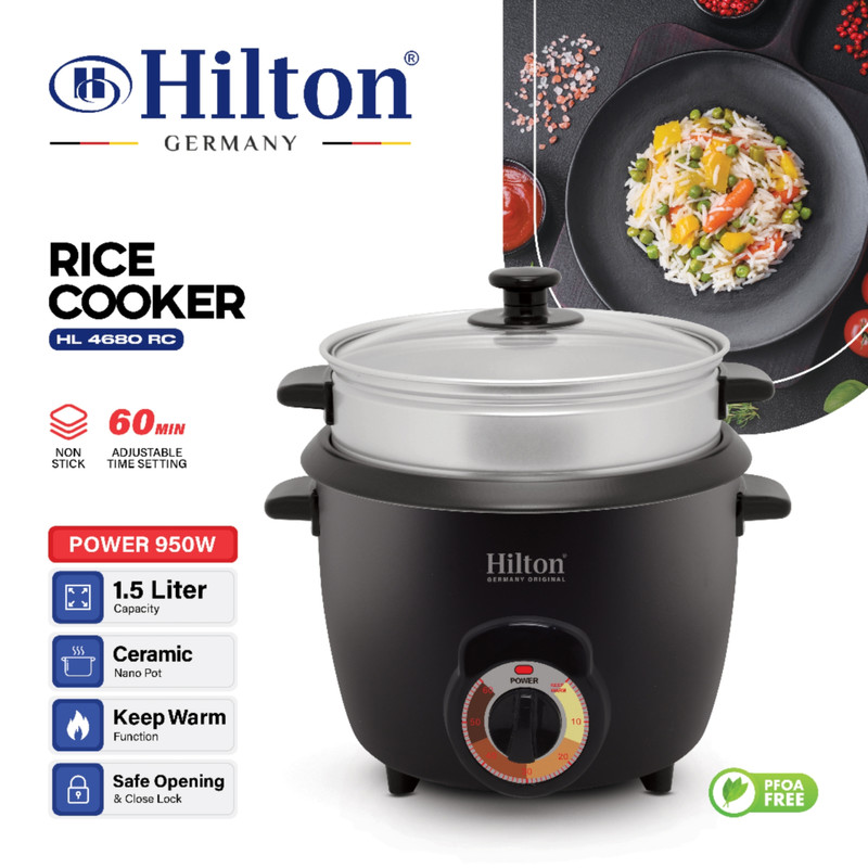 پلوپز،آرام پز و بخار پز هیلتون مدل HL_4680RC، قدرت دستگاه 950 وات، ظرفیت 1/5 لیتری،بخارپز آلومینیومی، عملکرد وارمر و گرم نگهداری خودکار، قابلیت تنظیم تایمر تا 60 دقیقه، ظرف و قابلمه گرانیتی ضد خش، کابل برق جدا شونده است