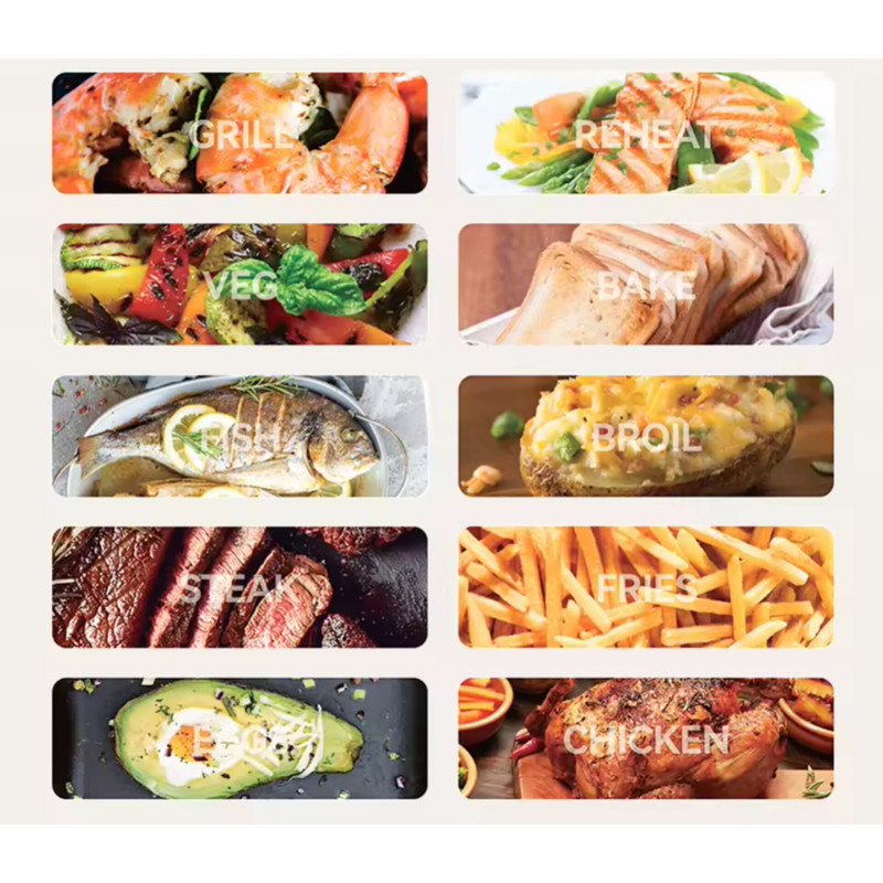 این مدل به صفحهنمایش لمسی رنگی LED مجهز شده و دارای 10 برنامه پخت از پیشتنظیمشده شامل یخزدایی، سیبزمینی، بال مرغ، مرغ، ماهی، کباب/روست، پیتزا، کیک، میگو و گریل است که استفاده از دستگاه را برای کاربران ساده و سریع میکند. همچنین امکان تنظیم زمان از 1 تا 60 دقیقه و دمای 50 تا 200 درجه سانتیگراد وجود دارد.