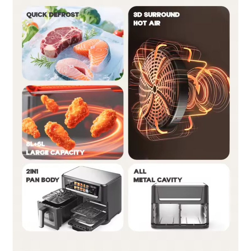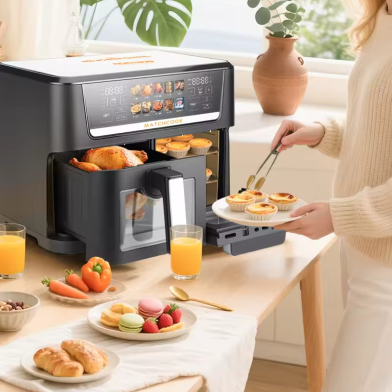 قابلیتهای کاربردی SYNC و MATCHCOOK این امکان را فراهم میکنند که دو مخزن بهصورت همزمان پخت را به پایان برسانند یا تنظیمات یک مخزن بهطور خودکار روی مخزن دیگر اعمال شود. طراحی گرمایش متناوب (Alternate Heating) و استفاده از فناوری گردش هوای سریع، موجب پخت یکنواخت در هر دو بخش دستگاه میشود.