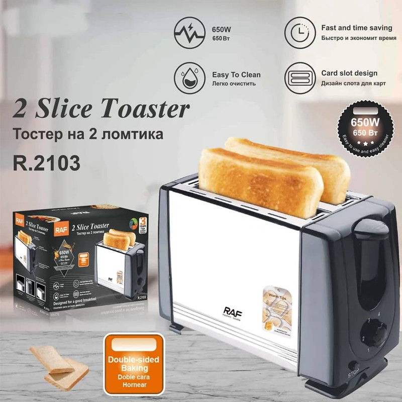 توستر RAF R.2103 با توان ۶۵۰ وات و طراحی جمعوجور، انتخابی عالی برای شروع روز با برشتهای داغ و خوشطعم است. دو اسلات مخصوص نان امکان آمادهسازی همزمان دو تکه را فراهم میکند. سطح تنظیم برنزه شدن به شما کنترل کامل روی طلایی شدن نان میدهد. عملکرد خودکار پاپآپ نان را پس از آماده شدن به بالا میآورد؛ بدون نیاز به تلاش اضافی. سینی خردهنان قابل جدا شدن تمیزکاری را ساده میکند؛ کار با لغو یا توقف عملیات نیز راحت و ایمن است. طراحی جمعوجور و ظاهر کلاسیک آن بهراحتی در هر آشپزخانهای جا میگیرد. اگر دنبال توستری هستی که سریع، کارآمد، و مناسب استفاده روزانه باشد، R.2103 انتخاب خوبی است.