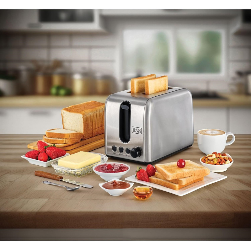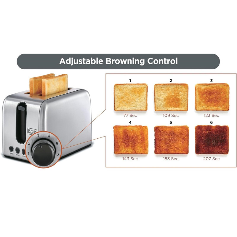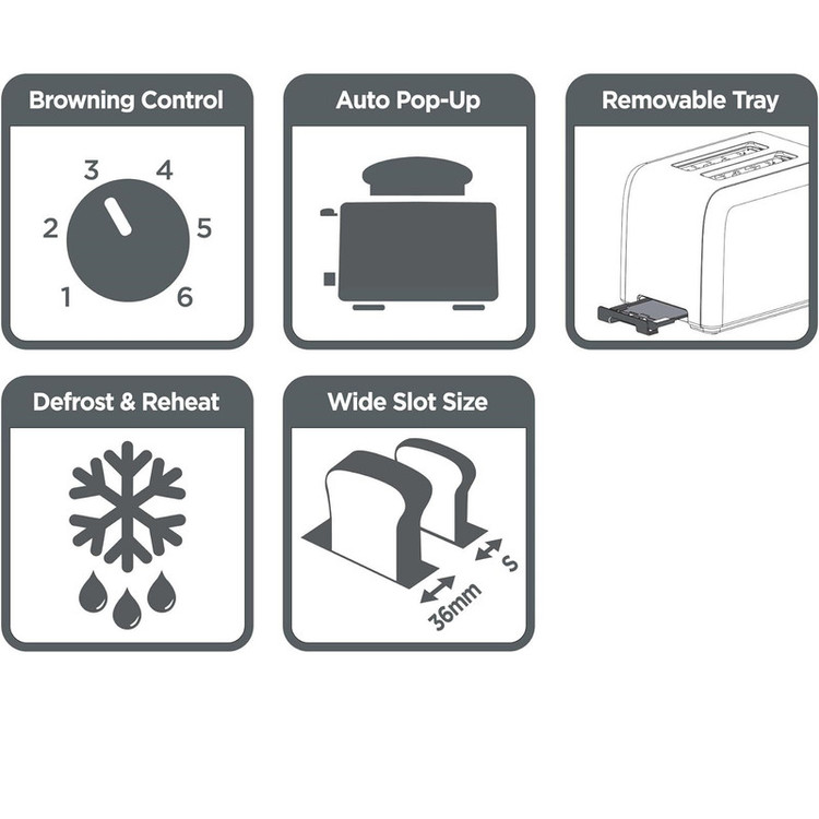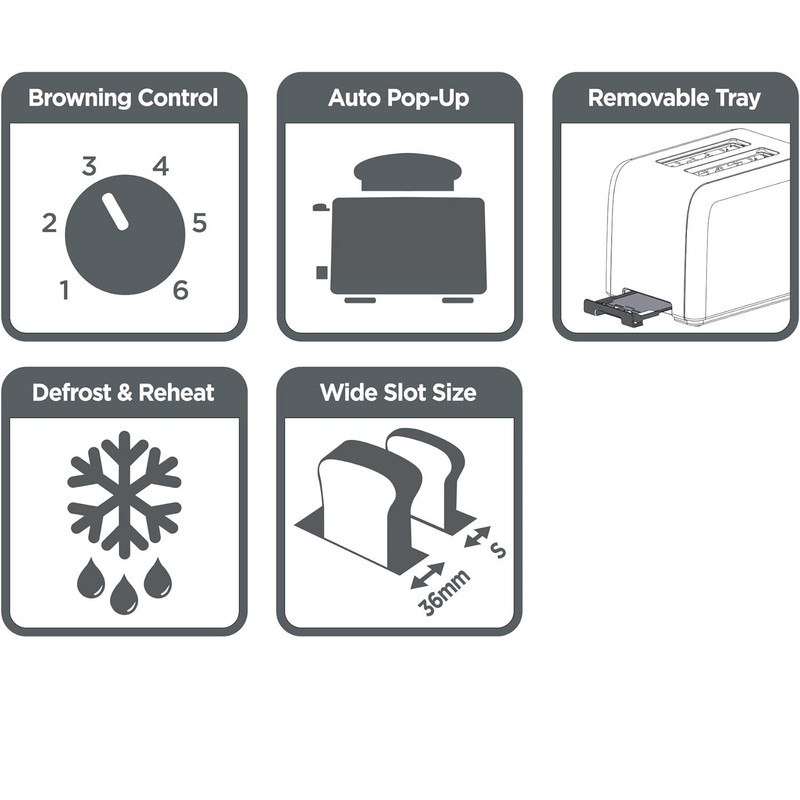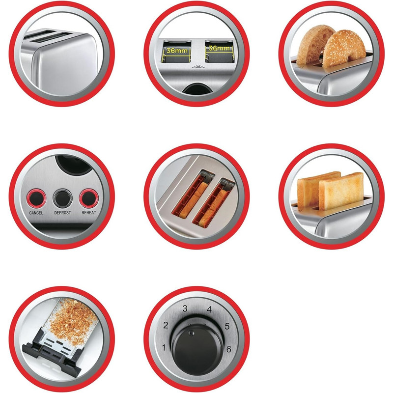 دستگاه خوش ساخت با ظاهری تمام فلزی، توان 1050 وات، دارای دو اسلات پهن، قابلیت یخ زدایی defrost، با قابلیت گرم کردن مجدد reheat، قطع کن خودکار، دارای تنظیم سطح برشتگی نان و گرما در 6 حالت بصورت ولومی، دارای کشوی خرده نان، بدنه استیل